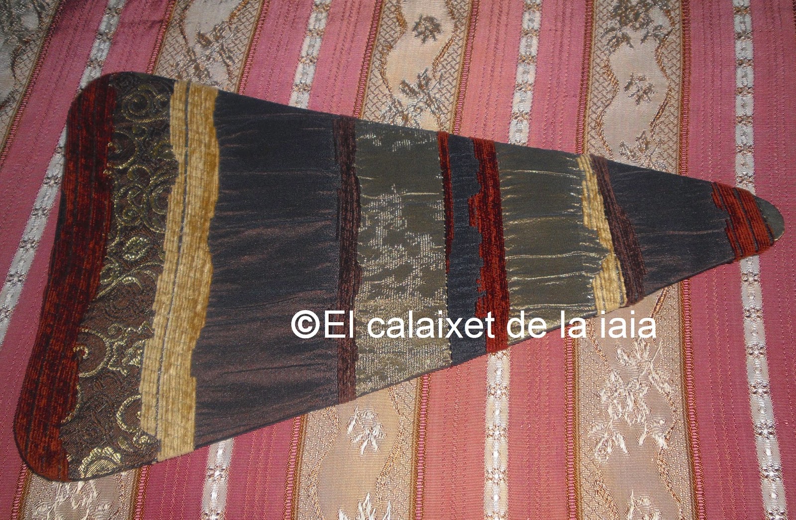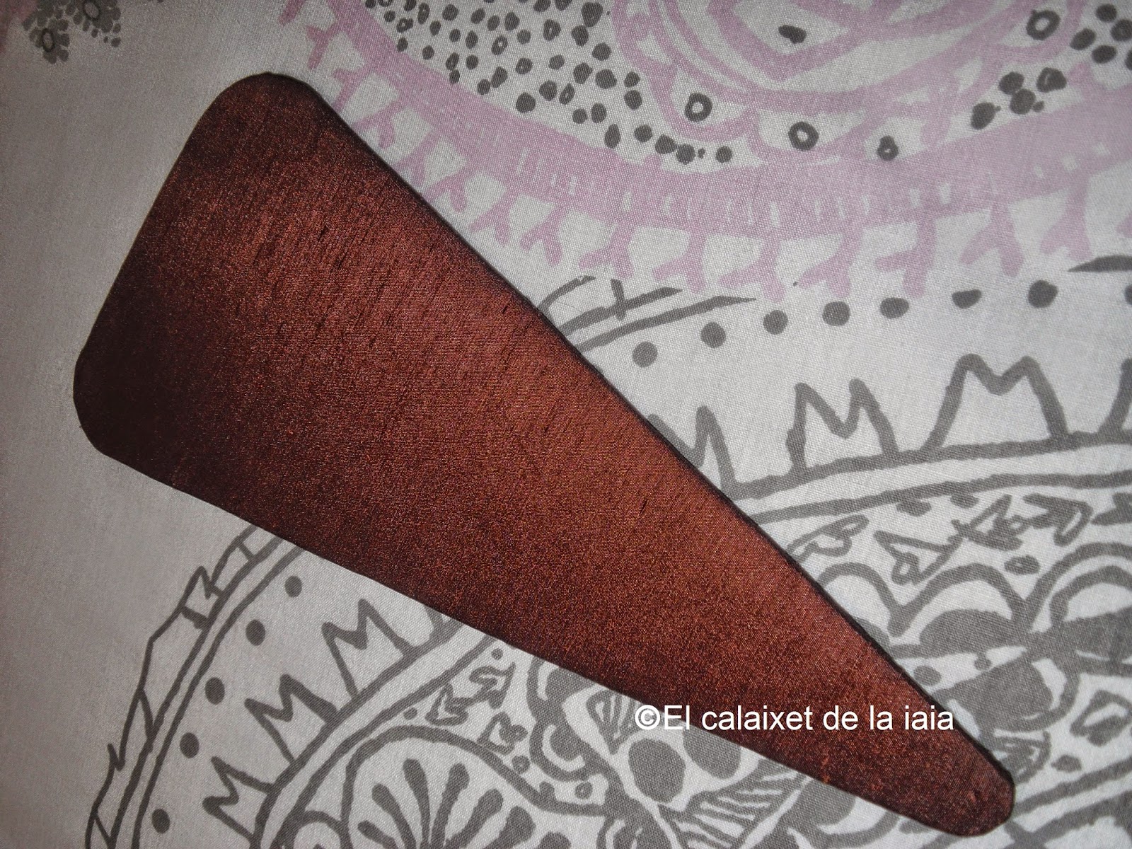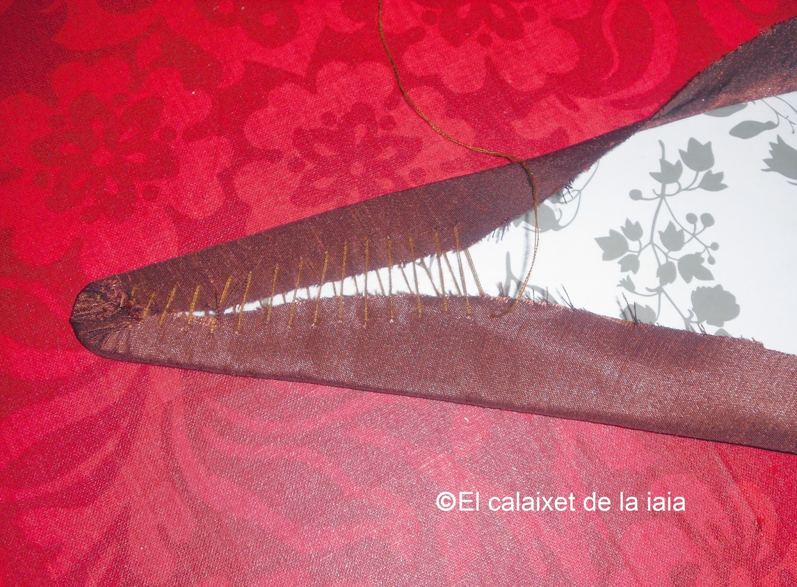 Cortamos la tela elegida, en éste caso tengo un trozo de seda, color chocolate, que me sobró de los zapatos nuevos, y que es muy parecido a el otomán que usé para los adornos de las mangas y el cordoncillo de la orilla del guardapèus y como le va bien, es el que voy a usar. Comenzamos cosiendo por la punta formando un cruzado de hilos tirando la tela para que quede perfectamente tensada