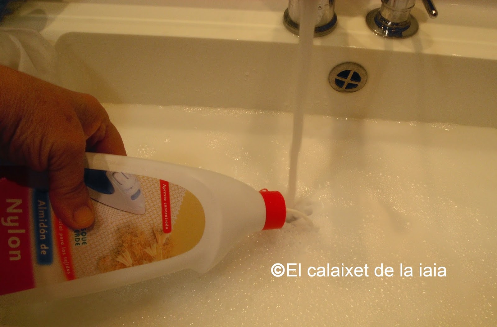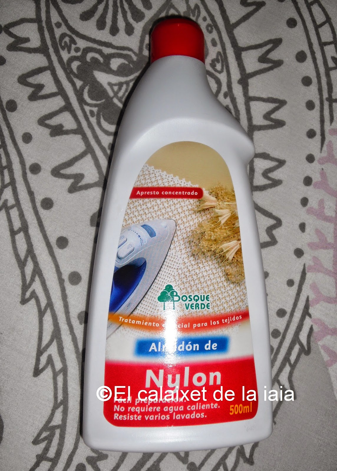 Si queréis hacer el almidonado en lavadora, necesitaréis tres botellas de almidón de Nylon, como éste de Bosque Verde, eliminando el centrifugado, y siguiendo las instrucciones del fabricante, aunque yo prefiero hacerlo a mano en un barreño grande o la bañera.