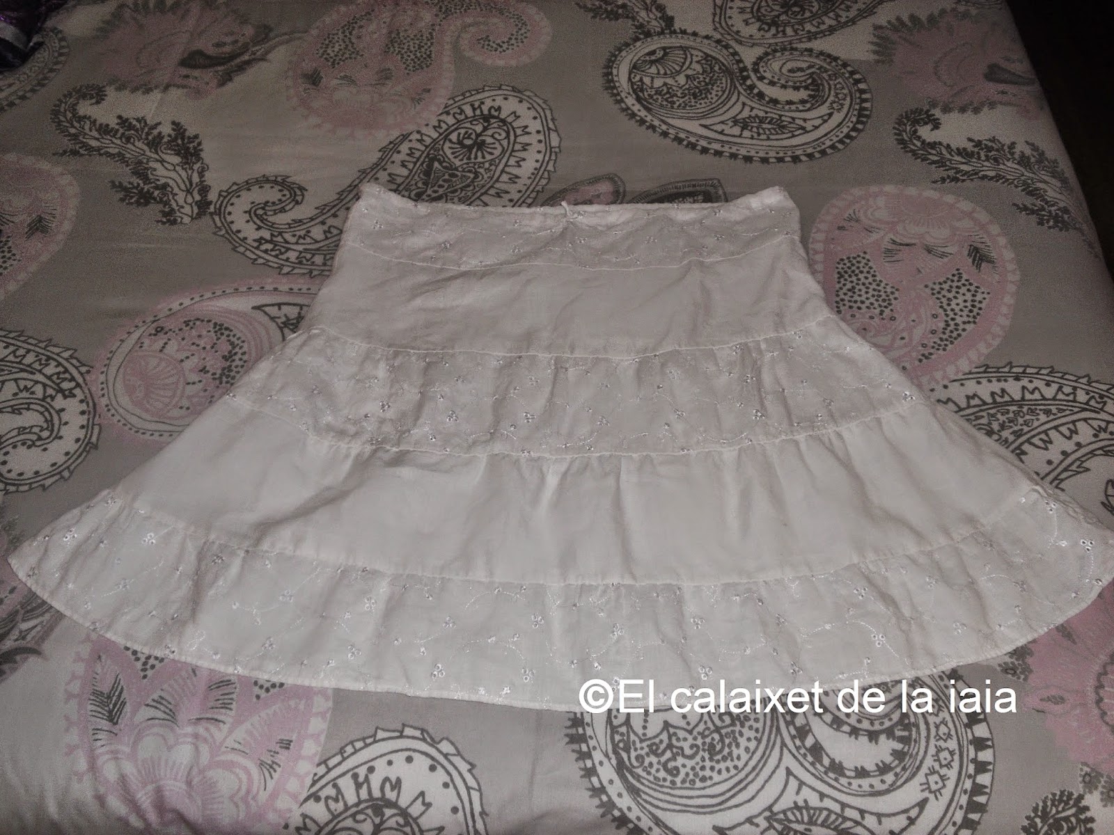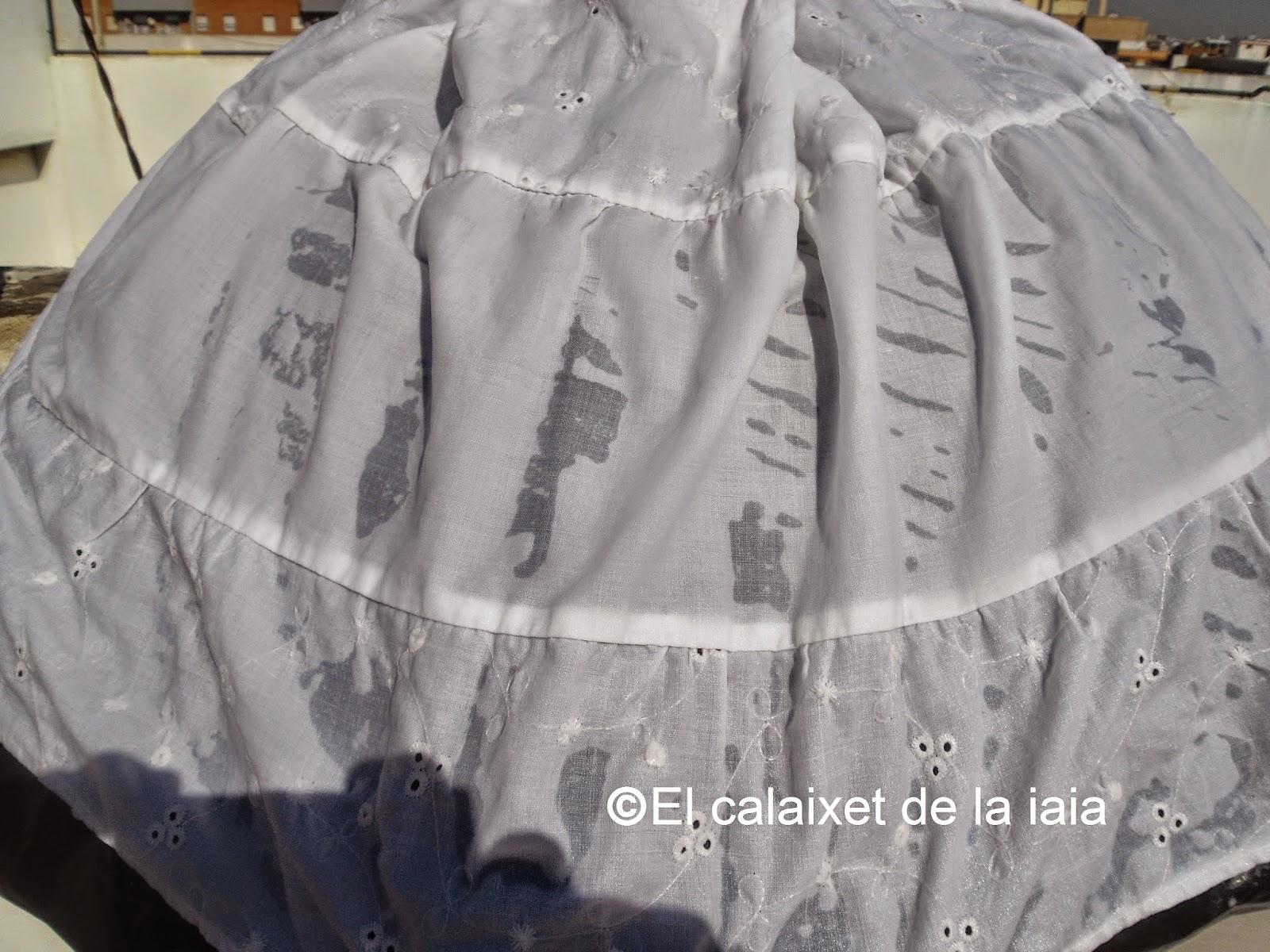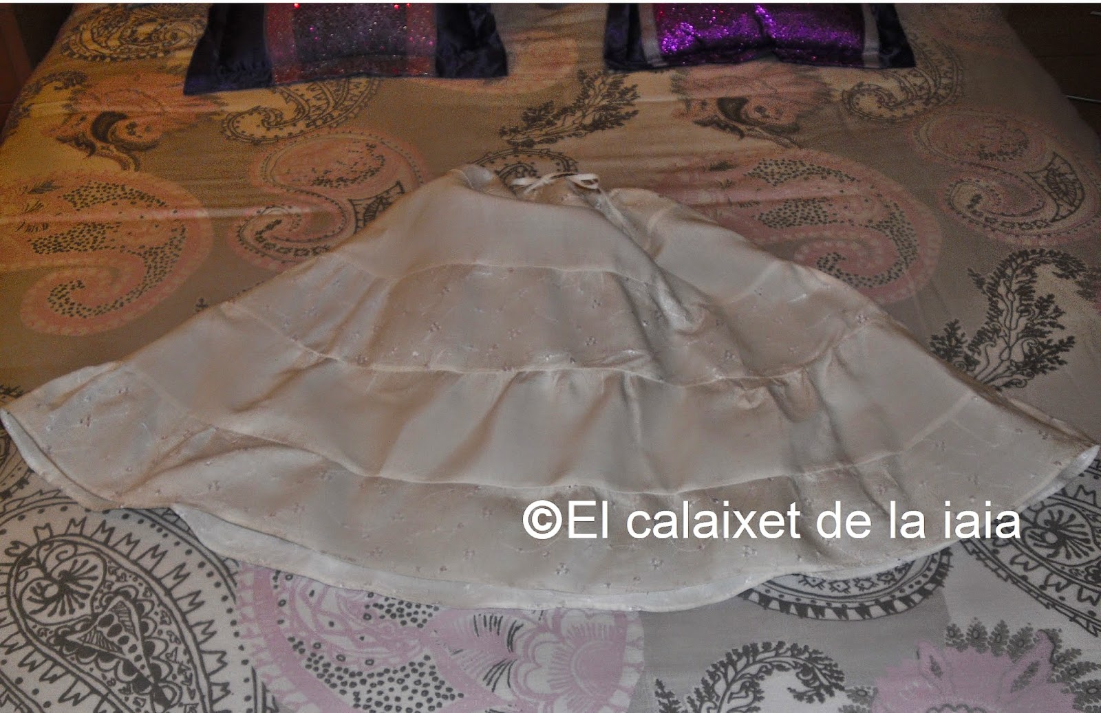 Estas no son «Les sinagües de valenciana» tradicionales, de mayor, ya que como os decía arriba, deben estar hechas con volantes superpuestos a la falda, que al almidonarse, dan el vuelo necesario y van confeccionadas a pañal, al igual que el «guardapèus» o falda, pero para salir del paso de explicar un almidonado exprés, creo que servirán.