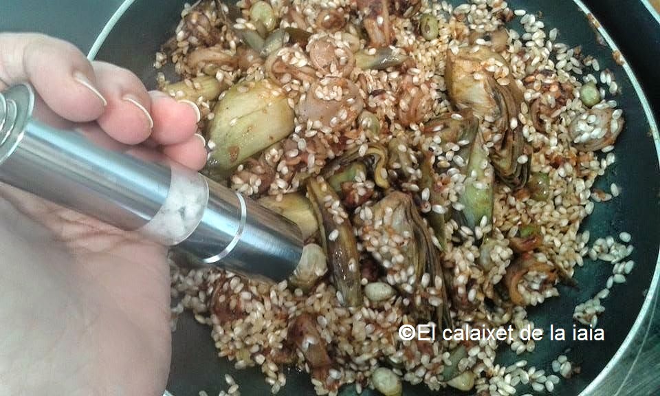 Ponemos un poquito de sal en la paella, aceite de oliva e incorporamos los chipirones hasta que se doren
