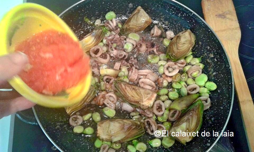 Limpiamos los chipirones, rallamos el tomate con el diente de ajo y la cebolla aparte, limpiamos las alcachofas y las hacemos en cuatro partes cada una, pelamos las habitas