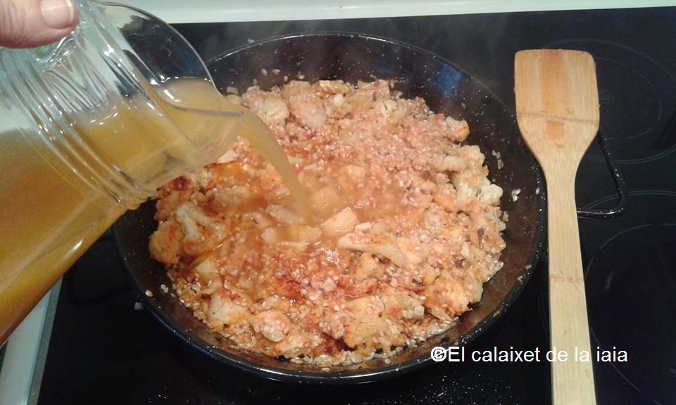 añadimos el caldo de pescado que tendremos preparado y caliente