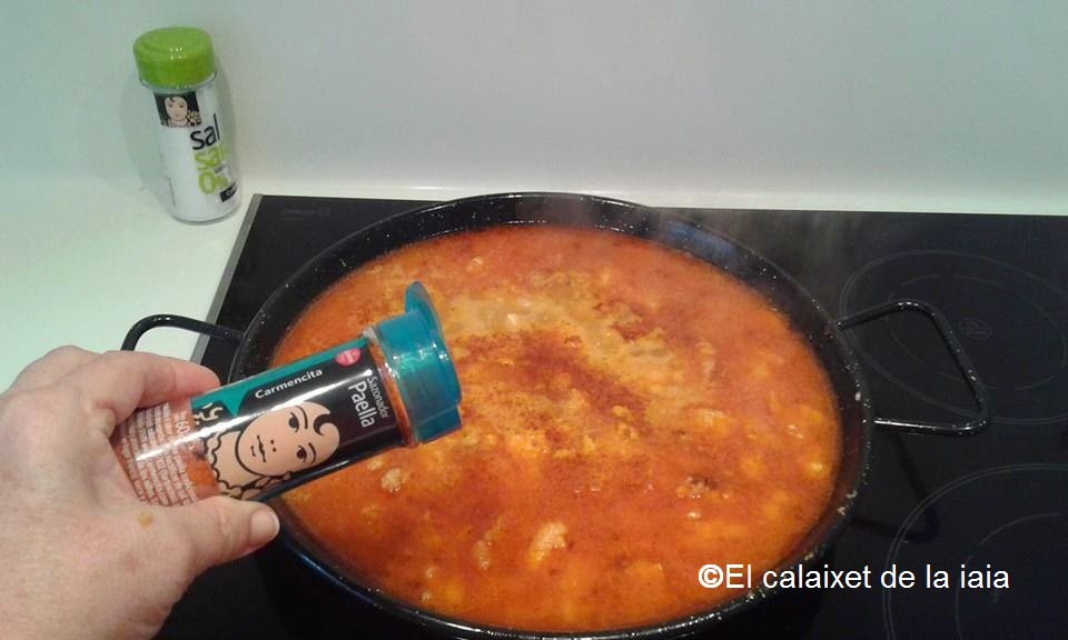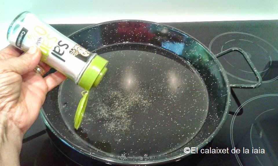 añadimos aceite de oliva en la paella y lo ponemos a calentar con sal por encima