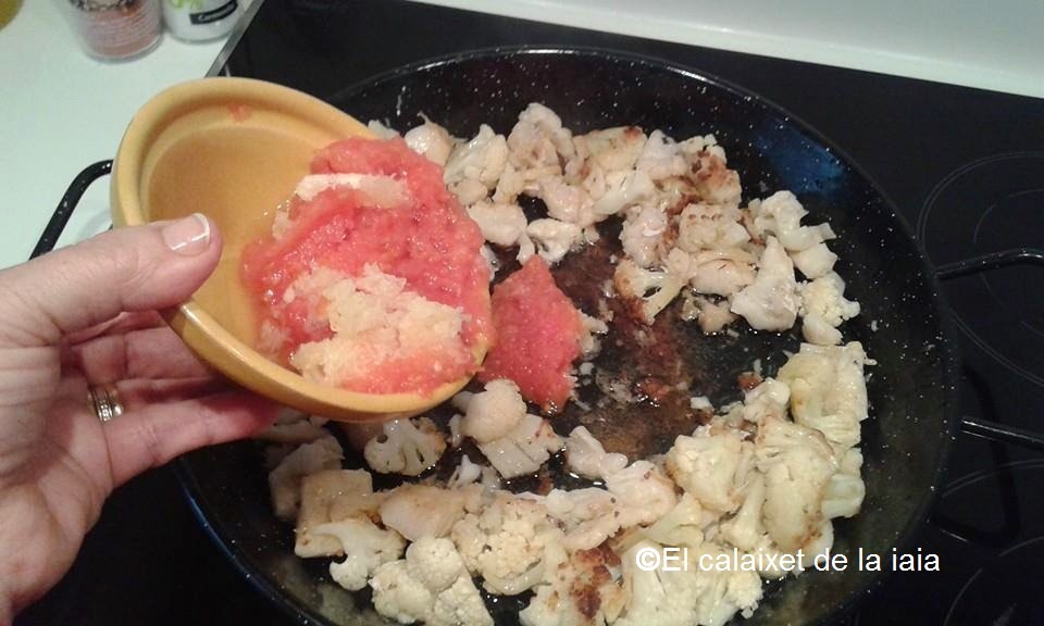 cuando esté la col al dente, subimos un poco el fuego e incorporamos el tomate y el ajo para freirlo