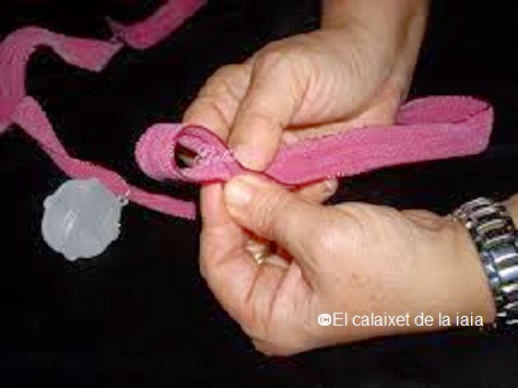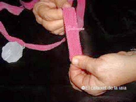 Doblamos la cinta hacia atrás y tenemos la opción de añadir un trozo de la misma con la medida necesaria para realizar una lazada en el cuello ó bien coserle un imperdible, con cierre de seguridad que tiene unos orificios para coser a la cinta y que venden en tres tamaños en Las Ollas de Barro y algunas mercerías