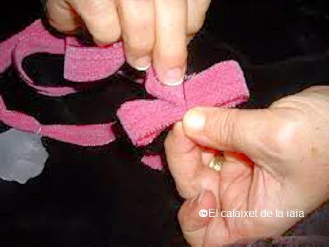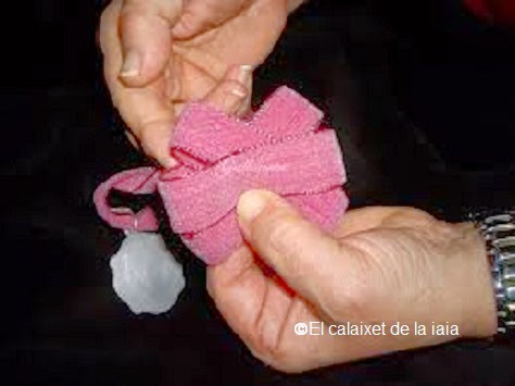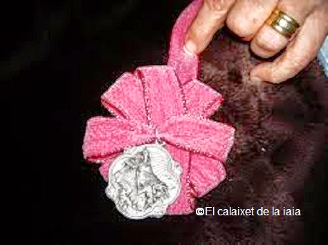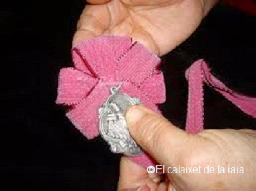Se va repitiendo el proceso según las bagas que se necesiten por la anchura de a cinta ó el tamaño de queramos de caramba. Se puede hacer sin medalla alguna para colocarla como adorno en el zapato de valenciana.