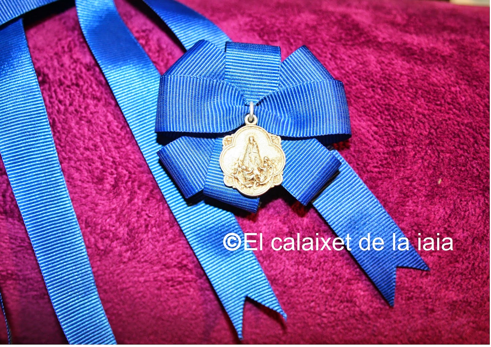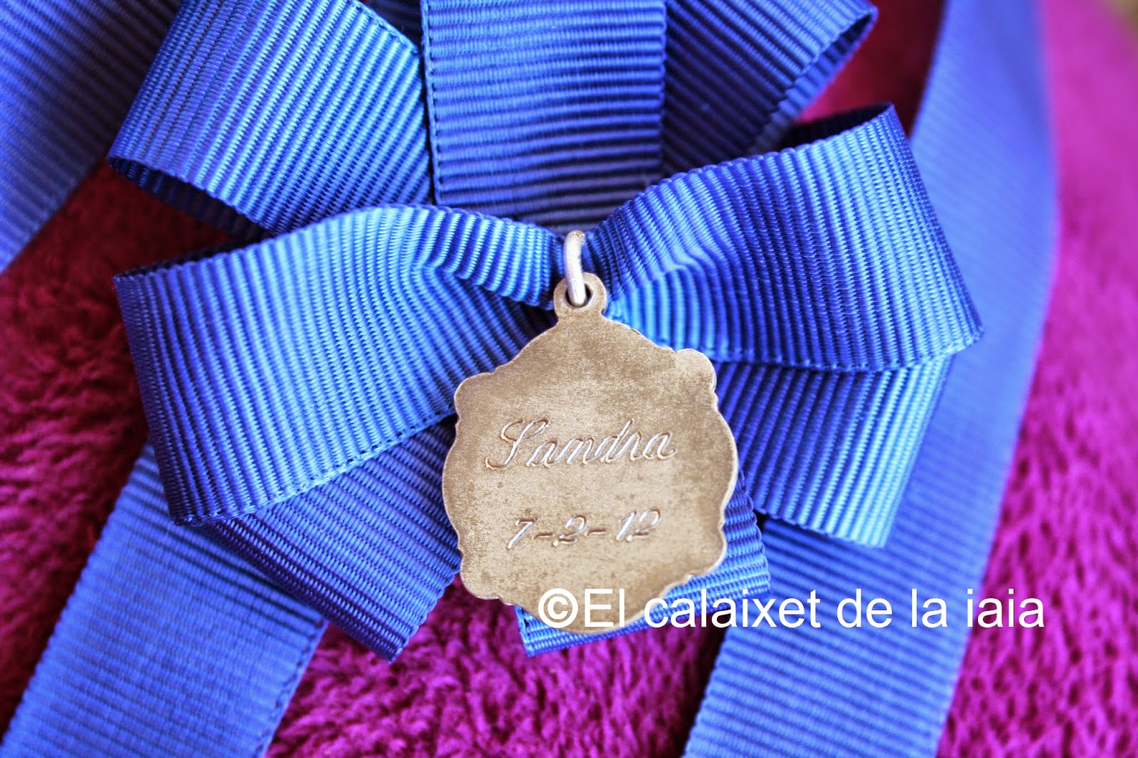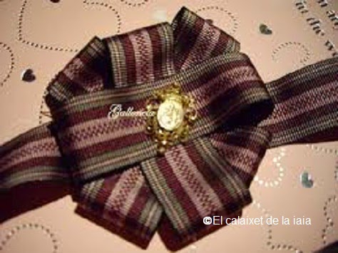 Bueno, comencemos a hacer una, y para ello cogemos una cinta que nos guste, procurando que no sea de organza ni raso, preferiblemente de seda o moaré que son las que utilizaban en aquella época, y por el extremo opuesto al que vamos a iniciarla, colocaremos la medalla que hemos elegido