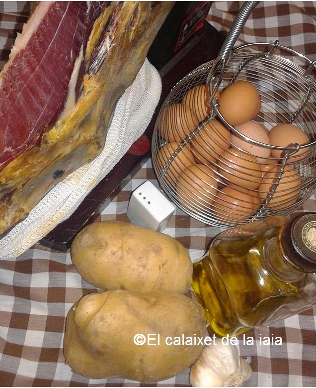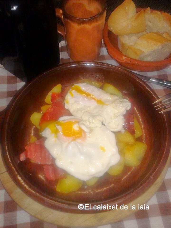 montamos el plato individualmente, primero con las patatas, añadimos el jamón (y me ha vuelto a ocurrir de nuevo, no me he dado cuenta que el visor de la cámara del móvil, se ha manchado con un salpicón de aceite y no lo he visto, hasta que he descargado las fotos para hacer esta entrada, os pido mil disculpas).