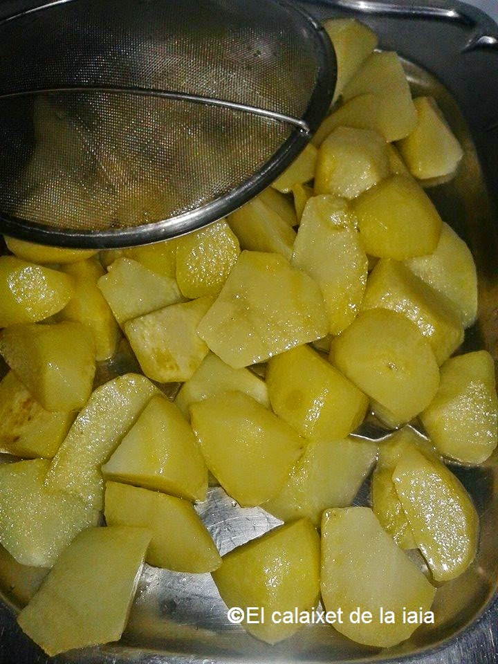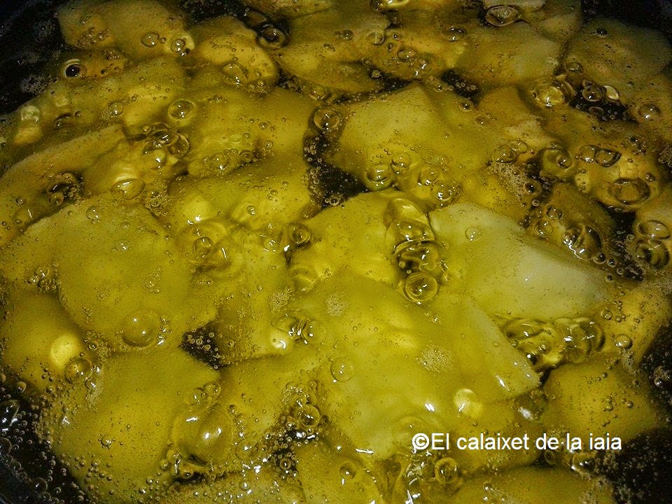 volvemos a poner las patatas en el aceite caliente y añadimos los ajos