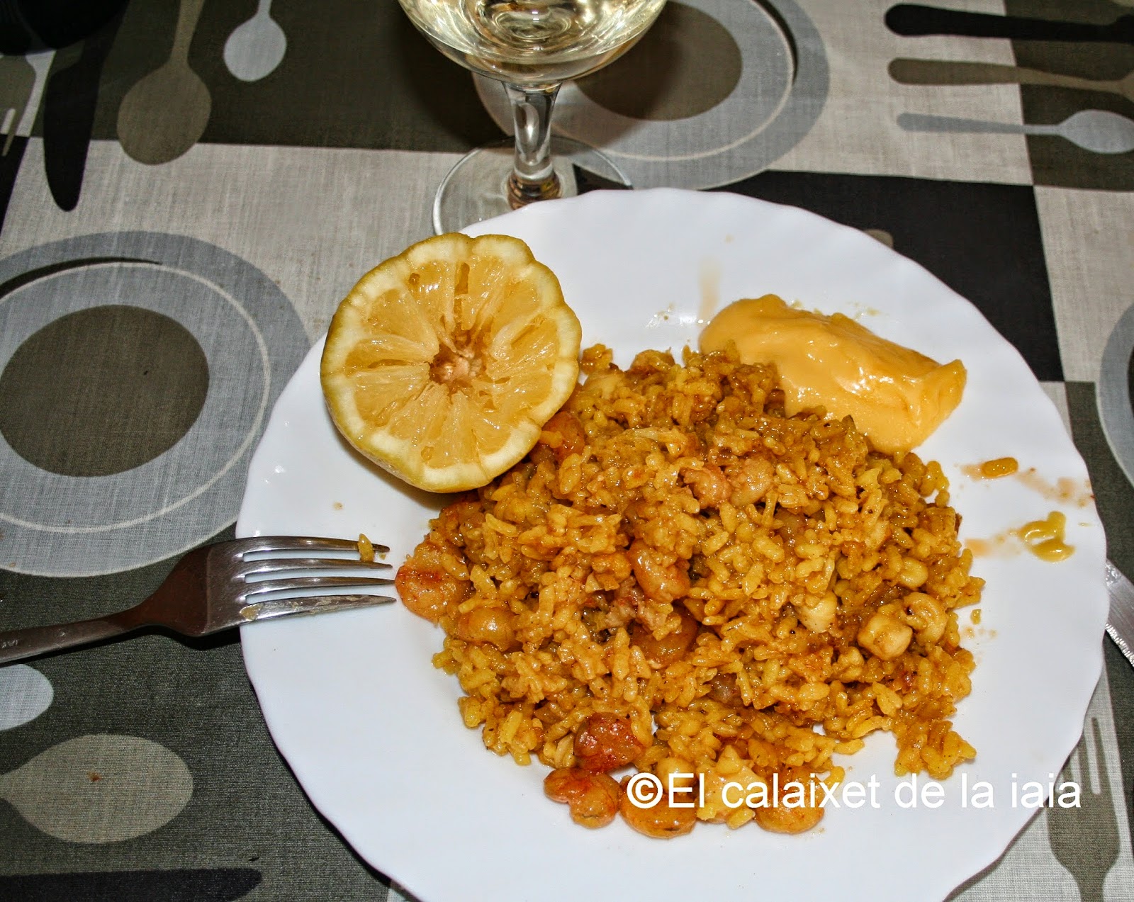 El arròs del senyoret es como una paella de marisco, pero para exquisitos, ya que con todo pelado, la hace comodísima de comer, por éso lo de «senyoret» y lo que la convierte en el arroz favorito de much@s, entre ellos de mis hijos, que son «els senyorets» de mi casa.