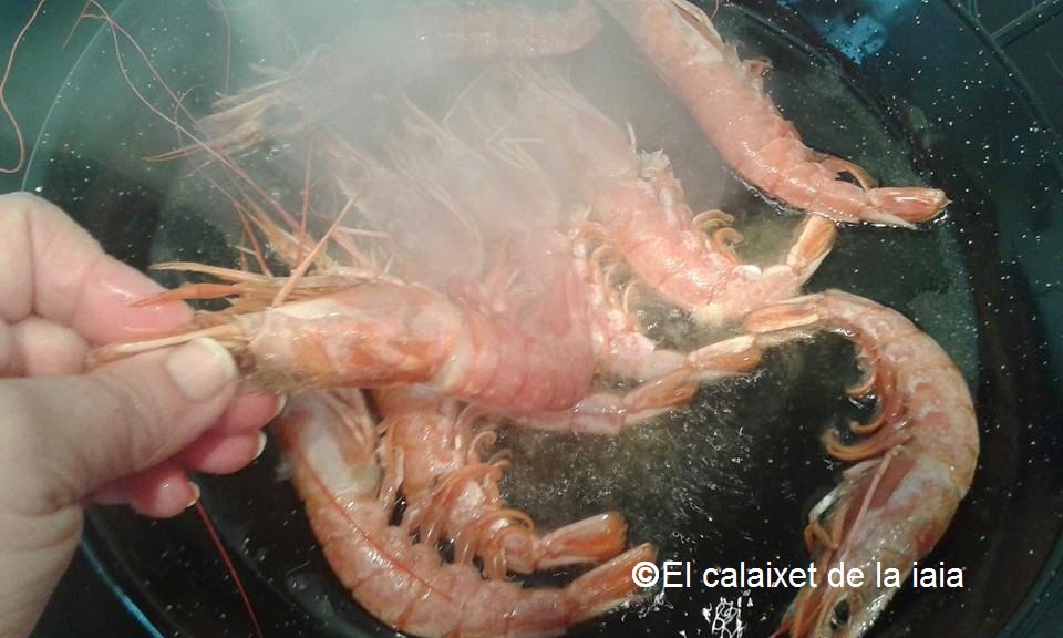 mientras pelamos los langostinos, reservamos y ponemos a hervir dos minutos las cabezas y las pieles