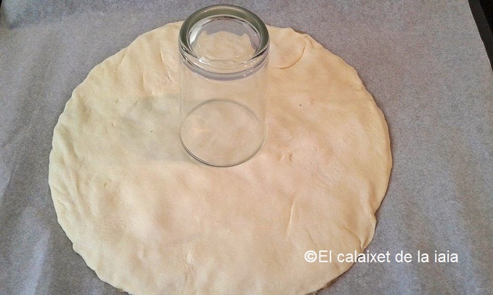 y con cuidado pondremos sobre papel sulfurizado en una bandeja de horno, con un vaso o taza, marcaremos el centro de la tarta sin cortar, solo marcando el hojaldre