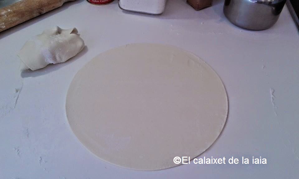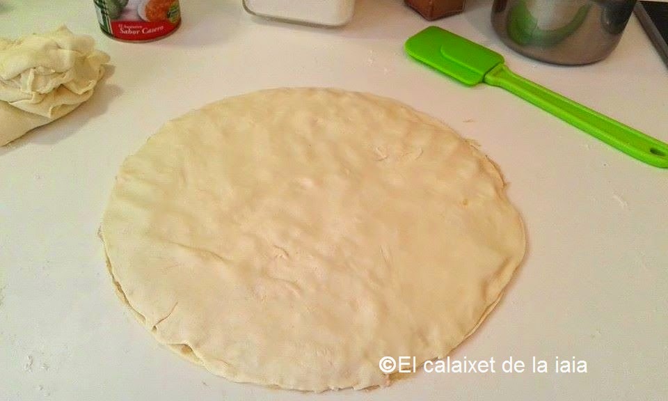 Ponemos un poco de harina sobre la superficie de trabajo, desenrrollamos las planchas de hojaldre y pasamos el rodillo para aplanarlas un poco