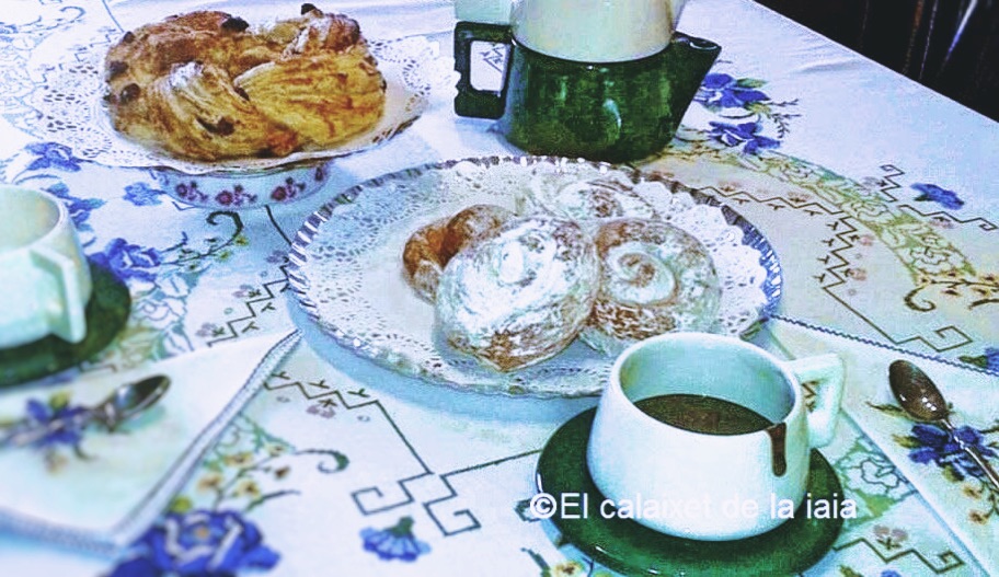 ensaimadas, pan tostado con mantequilla o sin ella, rosquilletas, panquemao, una bola de helado de vainilla, o una cucharada de nata recién montada,