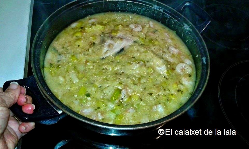removemos con cuidado meneando la cazuela con cuidado para que no se rompa. Retiramos la cazuela del fuego, y la introducimos en el horno precalentado y apagado, donde se mantendrá a buena temperatura mientras vamos degustando los aperitivos y entrantes.