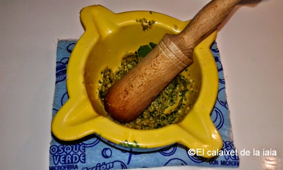 Majamos las almendras, con el diente de ajo, sal y perejil