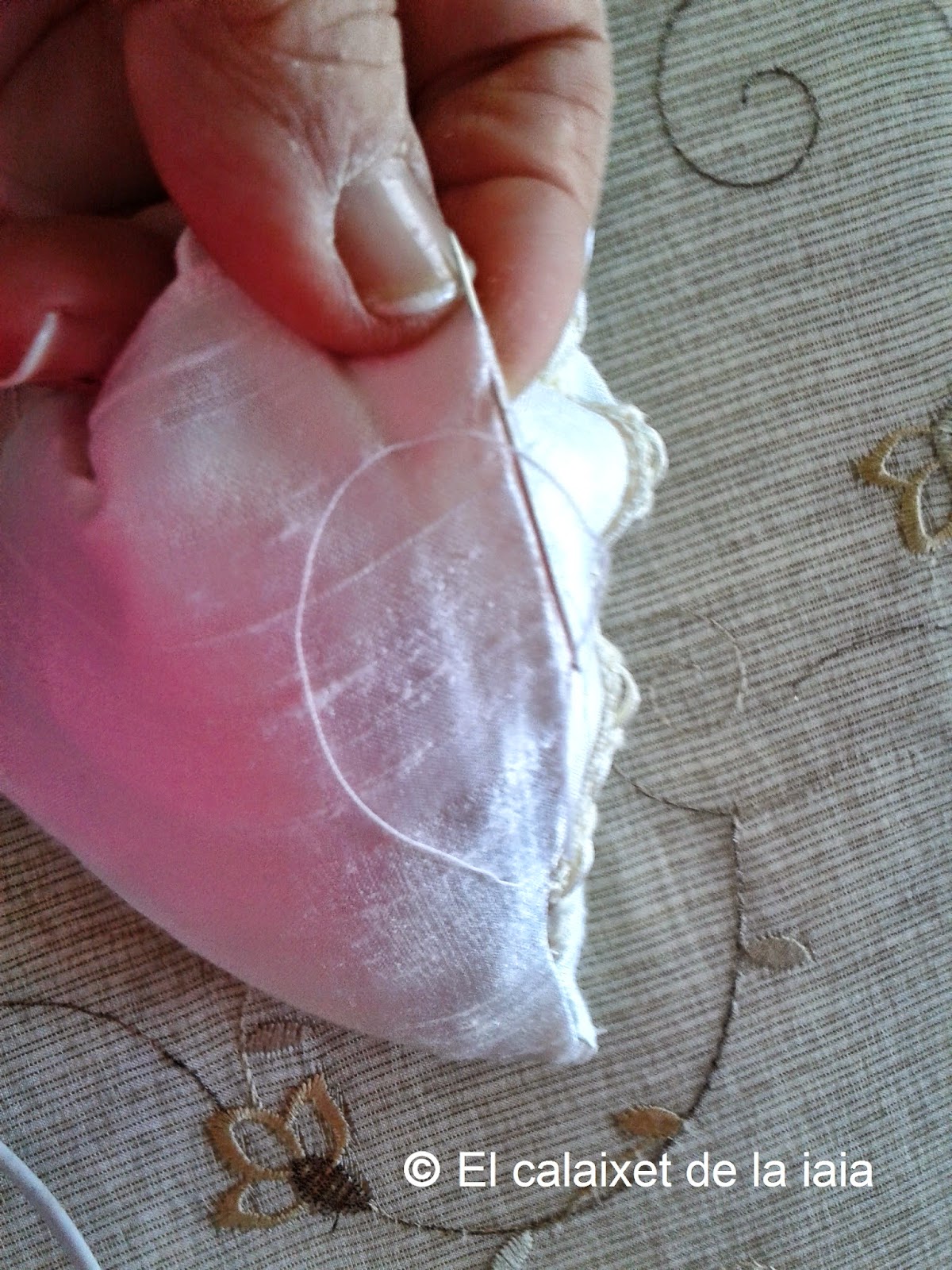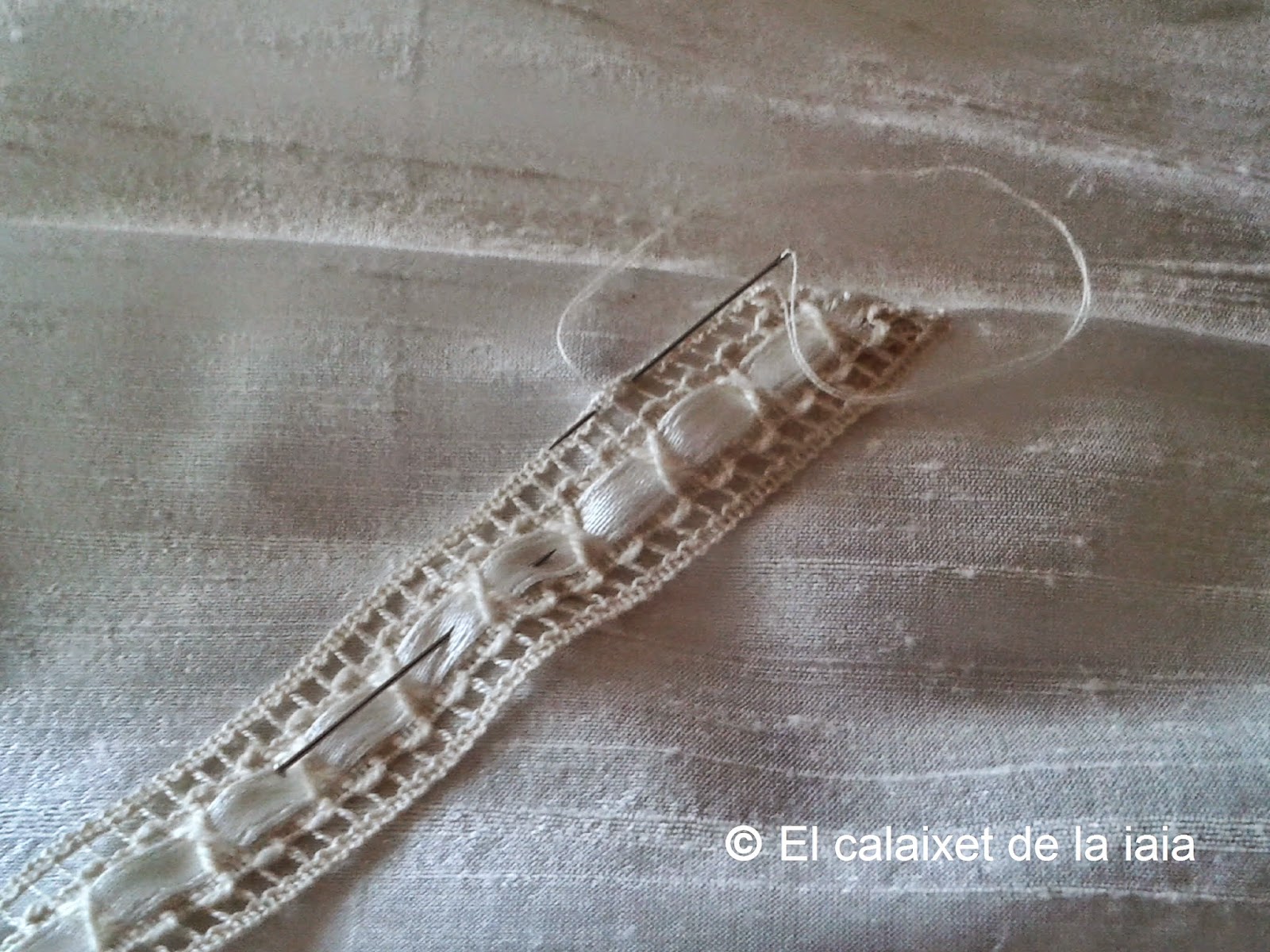 Me hubiera gustado hacer algo más elaborado, prro no tenía tiempo y la novia quería algo muy muy sencillo. Como la tela es de seda salvaje en blanco roto, procuré en lugar de puntillas blancas que es lo único que tenía en casa en éste mpomento y que no destacarían nada, poner un trozo de pasacintas rústico en color beig, con la cinta de raso en blanco y la cola de ratón en blanco y en beig, pero ésto va al gusto de la novia, hay quien prefiere mucha puntillas, lentejuelas a gogó y brillos…muuuchos brillos, cada cuál tiene un gusto ¿no?
