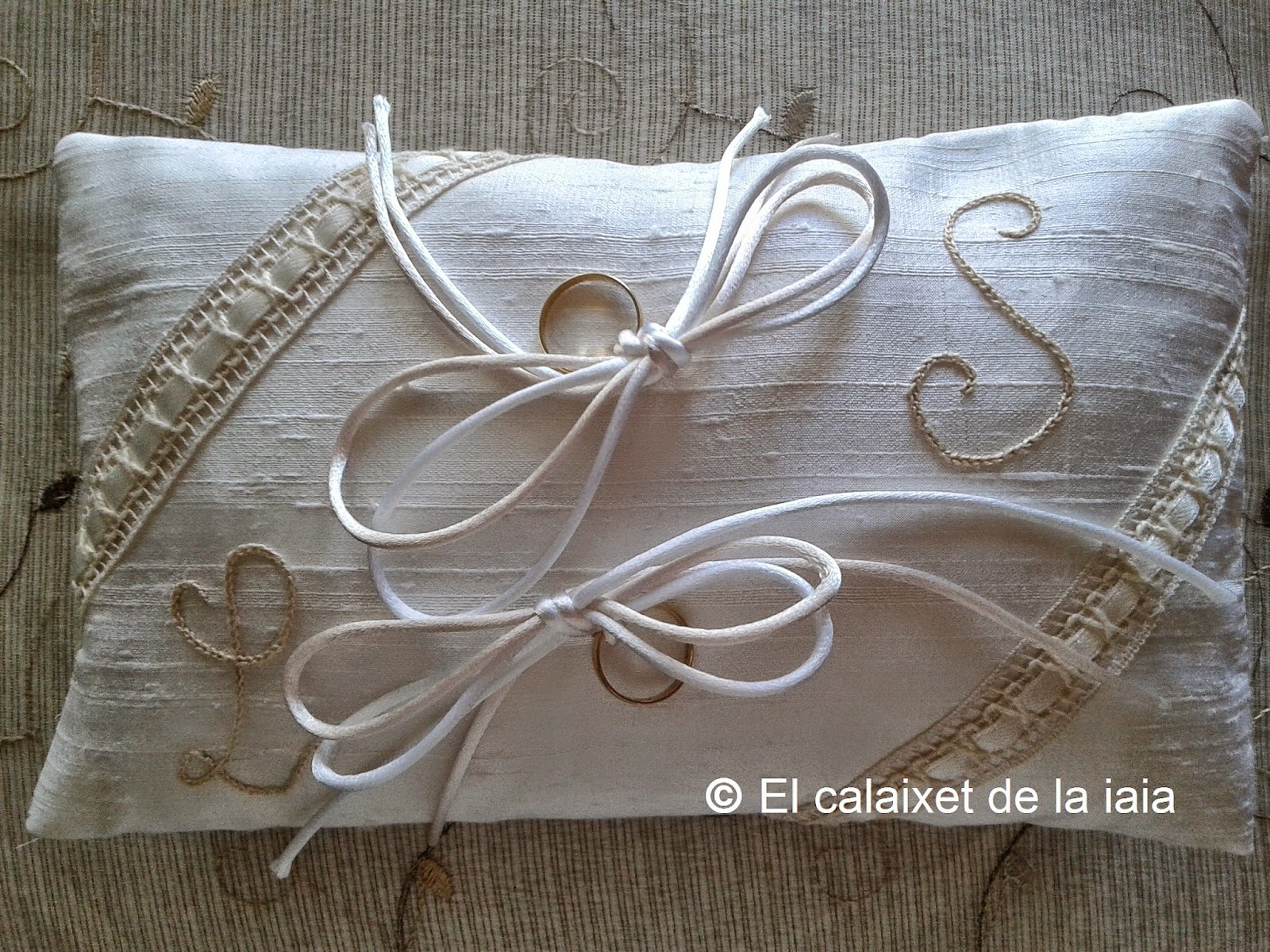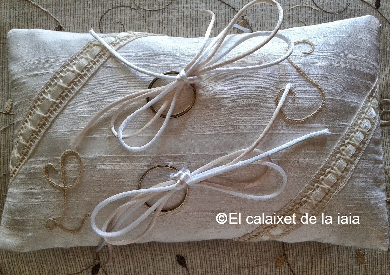 Cuando una de mis mejores amigas de toda la vida y que encima es vecina, me comentó que si tenía un trocito de tela para hacerle el cojín de las alianzas a su nena a quien vi nacer y crecer, no me lo pensé dos veces y me ofrecí a hacérselo yo. En todas las bodas importantes para mi por sentimiento, las alianzas han ido en cojines hechos por mi.