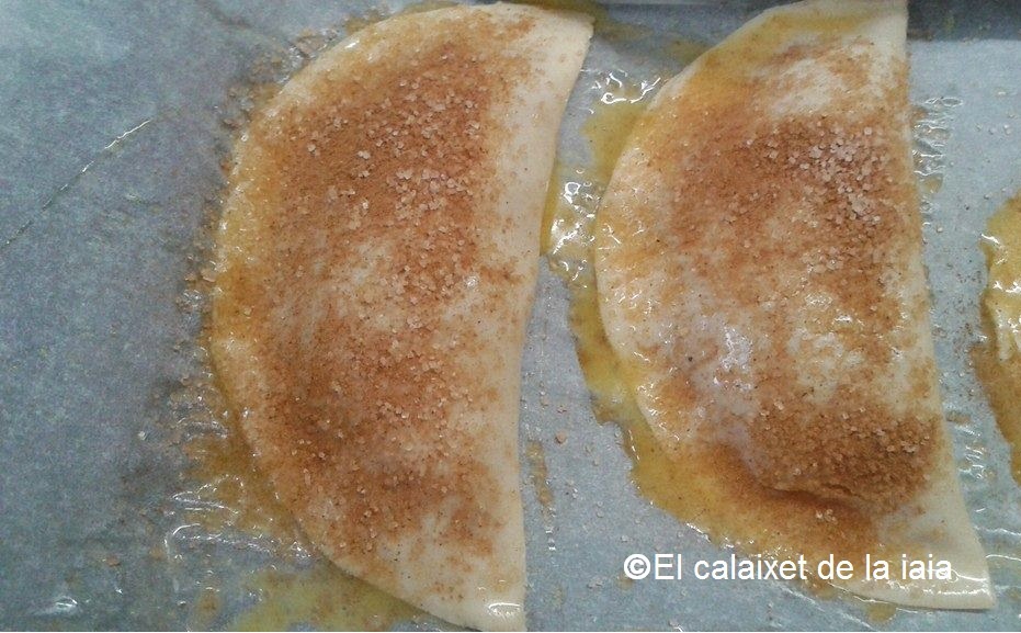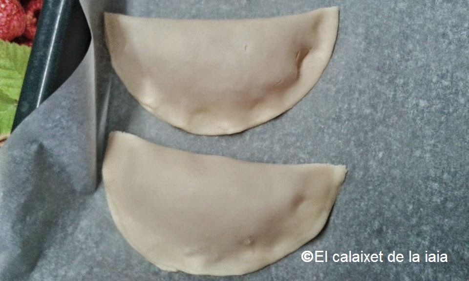 vamos cerrando cada una, colocándola sobre el papel de cocina en la bandeja que luego irá al horno y hacemos presión con los dedos para que queden los pastelitos cerrados y no se escape el relleno
