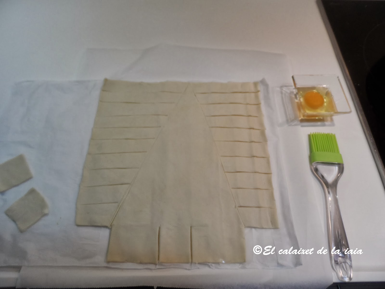 ponemos papel sulfurizado (de horno) sobre la superficie de trabajo, desenrollamos con cuidado la plancha de hojaldre y daremos la forma que más nos guste, puede ser redonda como una empanada, rectangular tipo paquete, un trenzado, o lo que nos apetezca porque la forma es lo de menos, lo importante es lo rico que está. A mi me ha apetecido darle forma de abeto, ya que estamos en Navidad y a los peques de la casa seguro que les encanta. Dibujaremos un abeto, cortamos las hojas de unos dos cm. de ancho pero reservamos los restos de masa que nos ayudarán a formar el tronco y terminar de cerrar luego el abeto