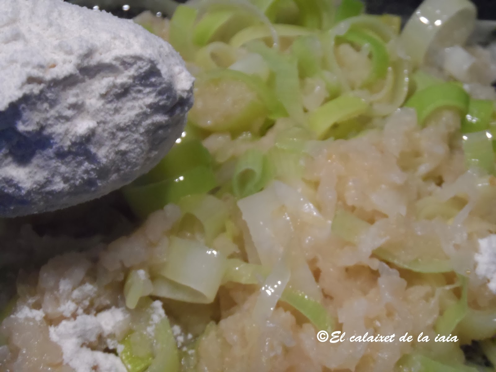 Rallamos la cebolla y la ponemos a pochar junto al puerro, en un poco de aceite de oliva