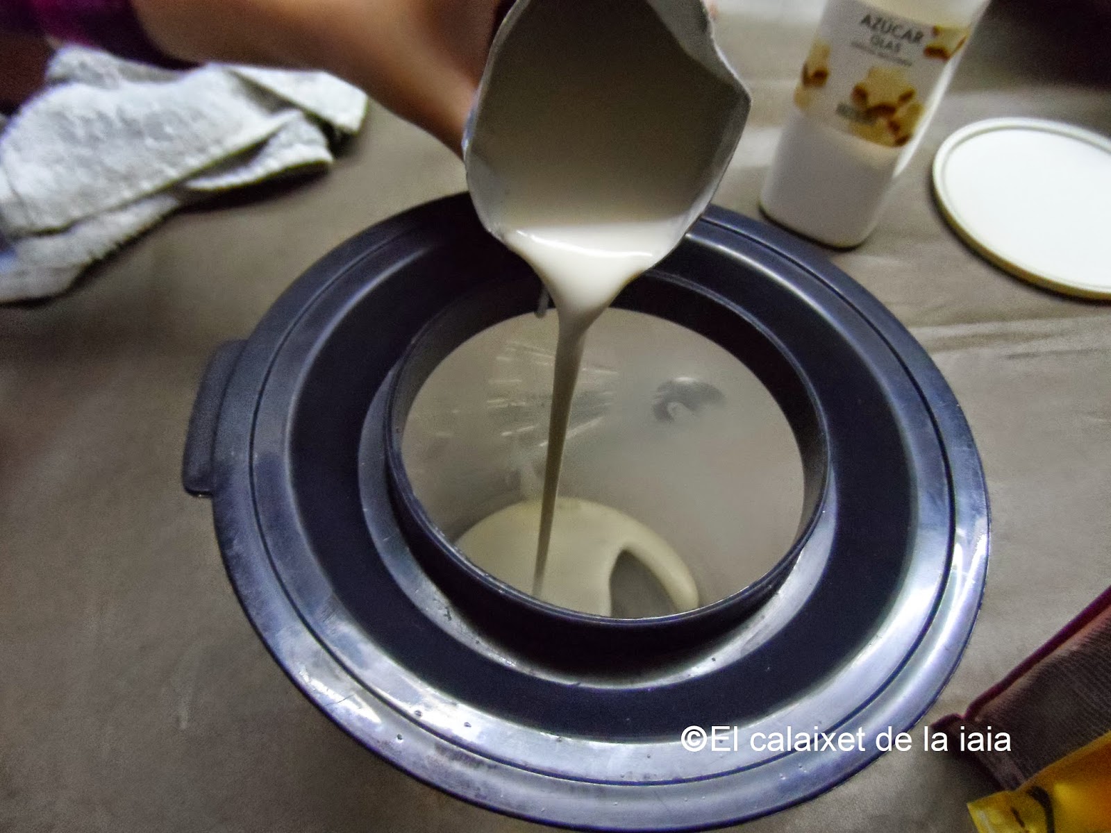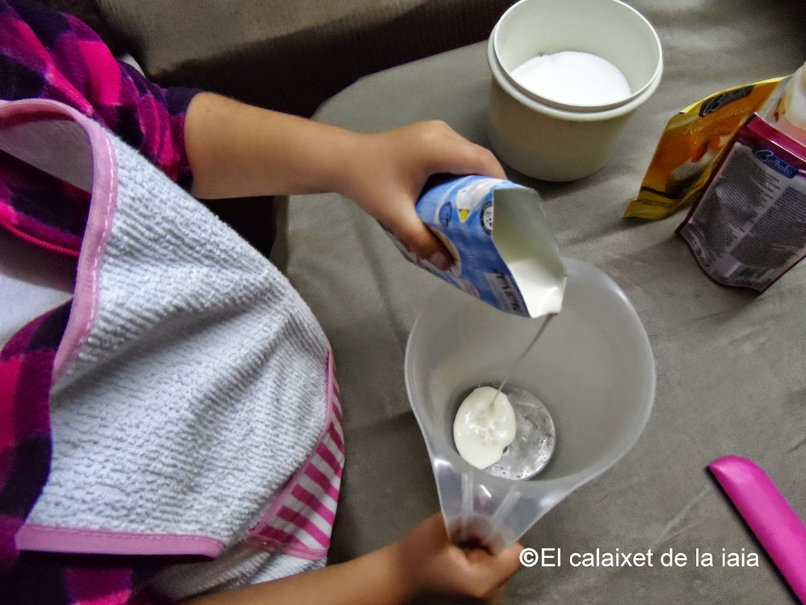 echamos el resto de la nata en un recipiente para batir con un sobre de cuajada y calentamos en el micro hasta llevar a ebullición en pulsaciones de 20 seg.