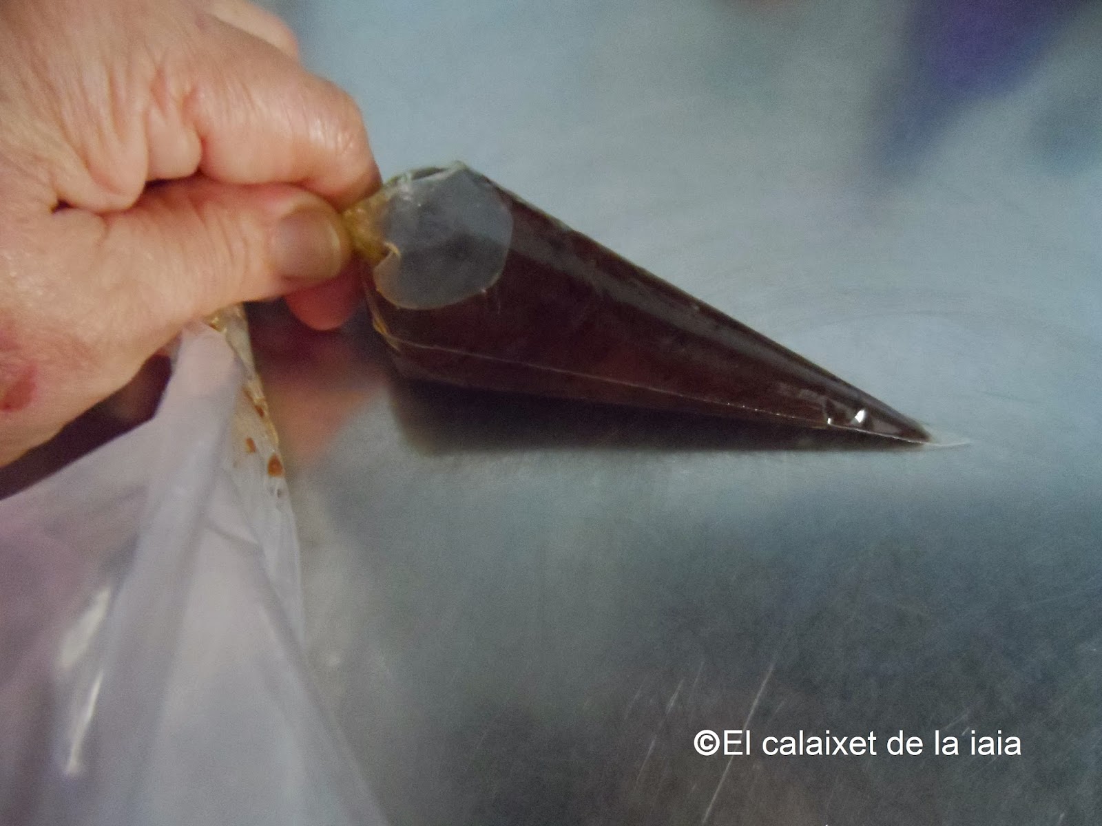 en una pequeña manga pastelera ponemos el chocolate que hemos reservado en una taza en el frigo.
