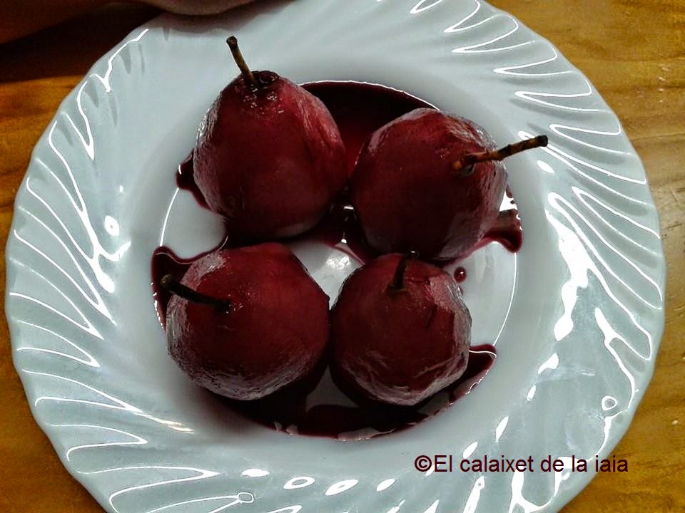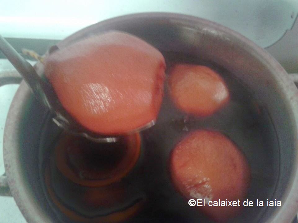 una vez comienza a hervir colocamos las peras, teniendo la precaución de ir dándoles vueltas con una cuchara de madera, con delicadeza para que no se nos estropeen. Según la clase de la pera, suele estar en su punto en unos 20 minutos, comprobad con un palito de brocheta.