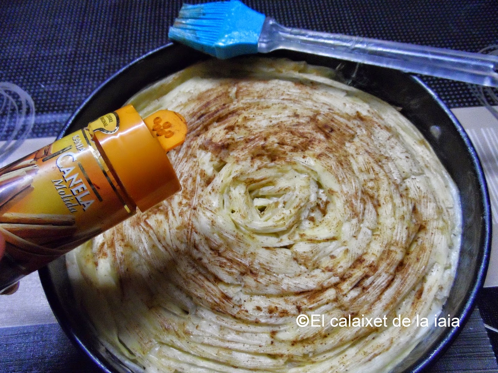 cuando ya estén todas colocadas, pincelamos por encima con mas mantequilla y espolvoreamos de canela.