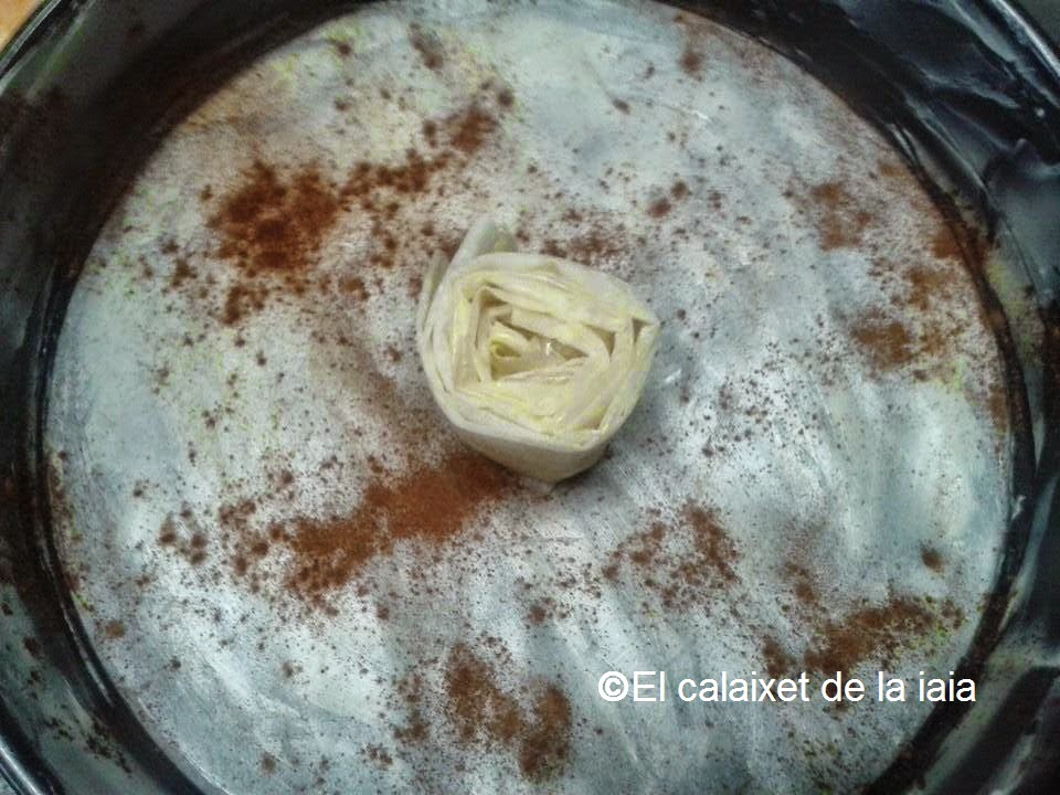 Colocaremos la primera hoja doblada sobre la base del molde formando una especie de espiral, de flor o ensaimada. Os recomiendo no hacerlo tan apretada, sino con una forma mas holgada.