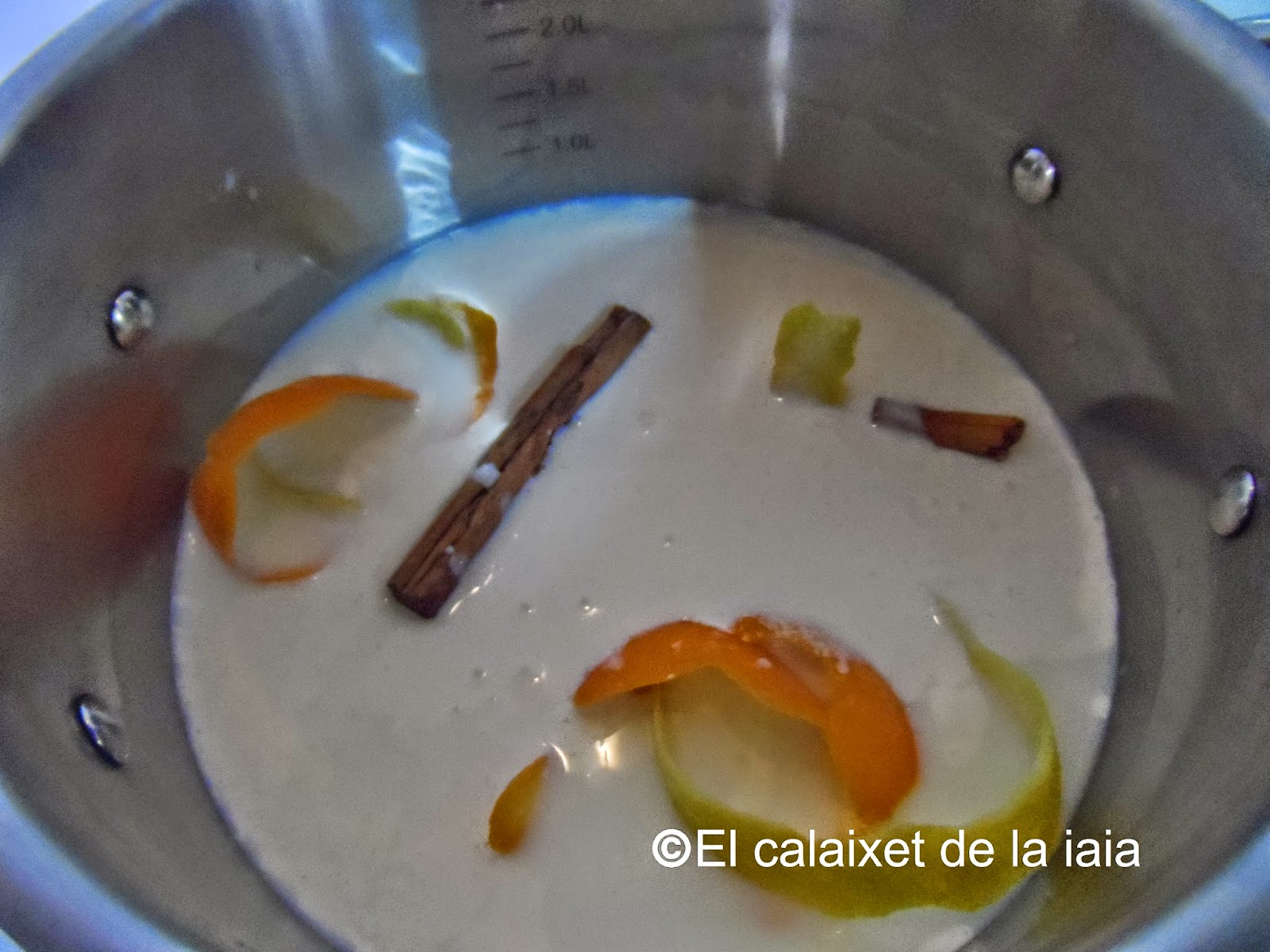 ponemos las pieles en un cazo añadimos la leche, la nata, y el palito de canela y ponemos a hervir a fuego suave para que infusione. Removed en todo momento para que no se nos pegue, esto es importantísimo