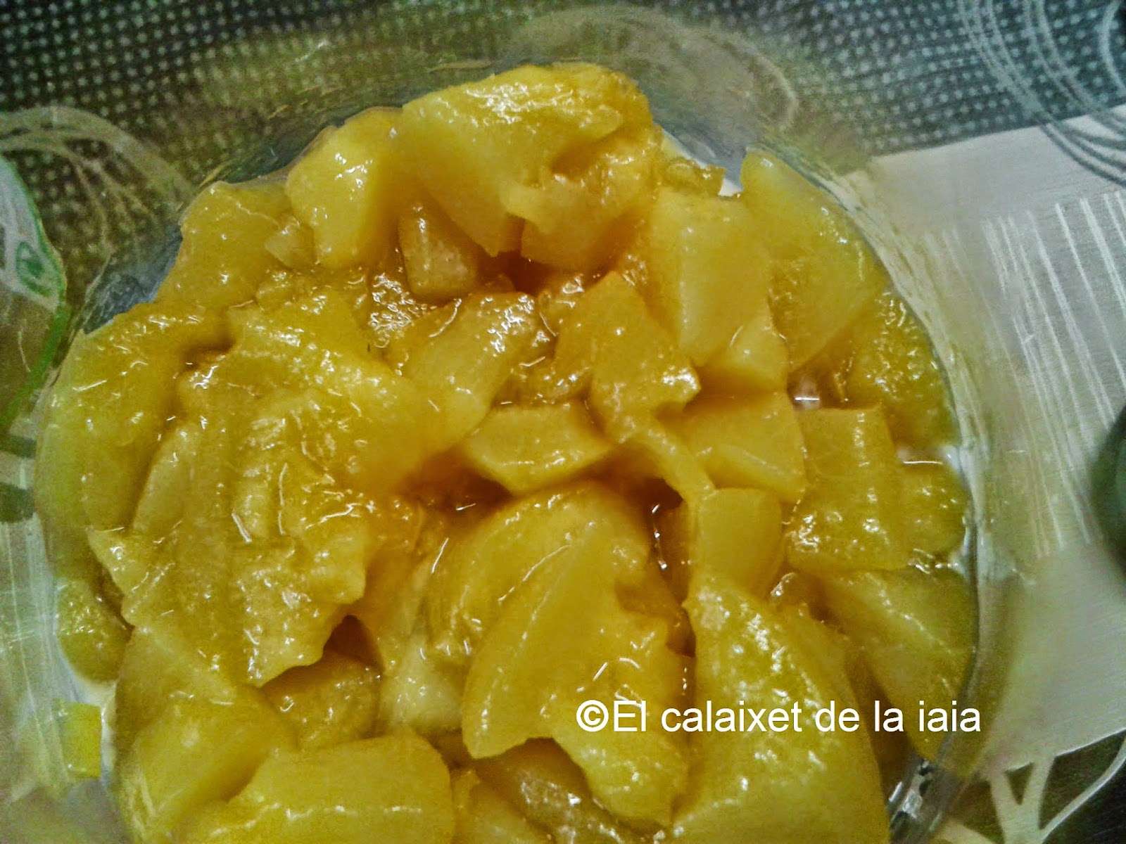 Seguro que en la despensa tenéis un socorrido bote de melocotón en almíbar o en su defecto de piña…cuantos apuros nos solucionan ¿eh?, ésta vez lo he preparado para un amigo especial con melocotón, pero con piña también sale delicioso.
