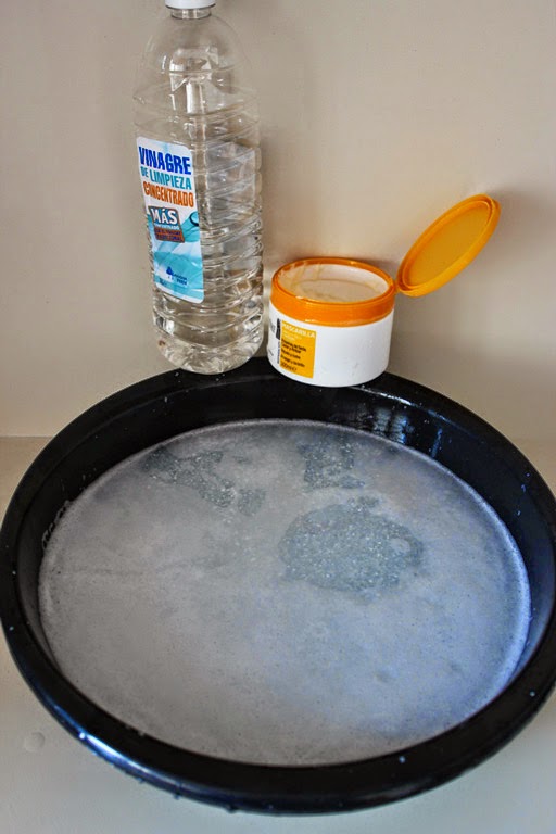 Al día siguiente, y en horas de sol, preparad una mezcla con el zumo de dos limones y una cucharada de bicarbonato. Frotar con ésta pasta sobre las manchas y dejar unos minutos al sol. Enjuagar y frotar suavemente, con un jabón si es de casa mejor.
