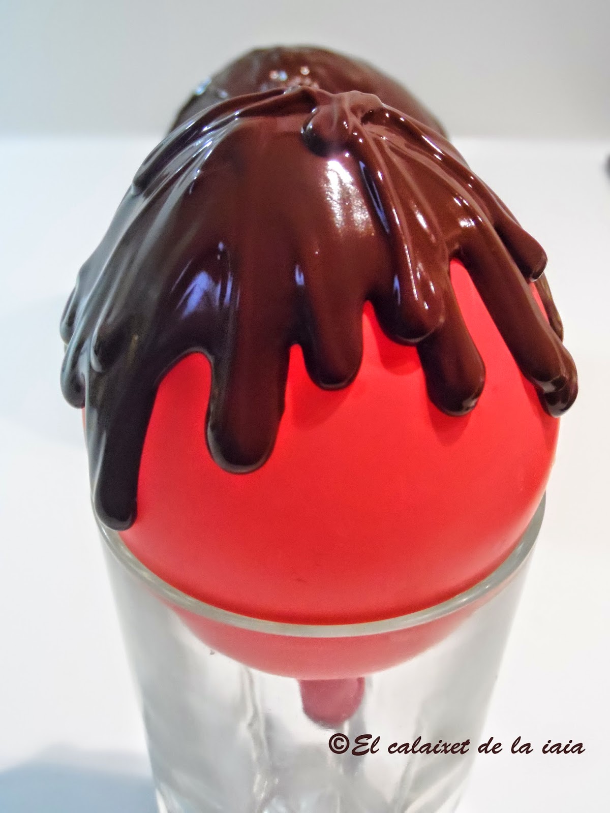 vamos echando el chocolate sobre el globo de forma que chorree por los lados y dejamos enfriar en el frigo