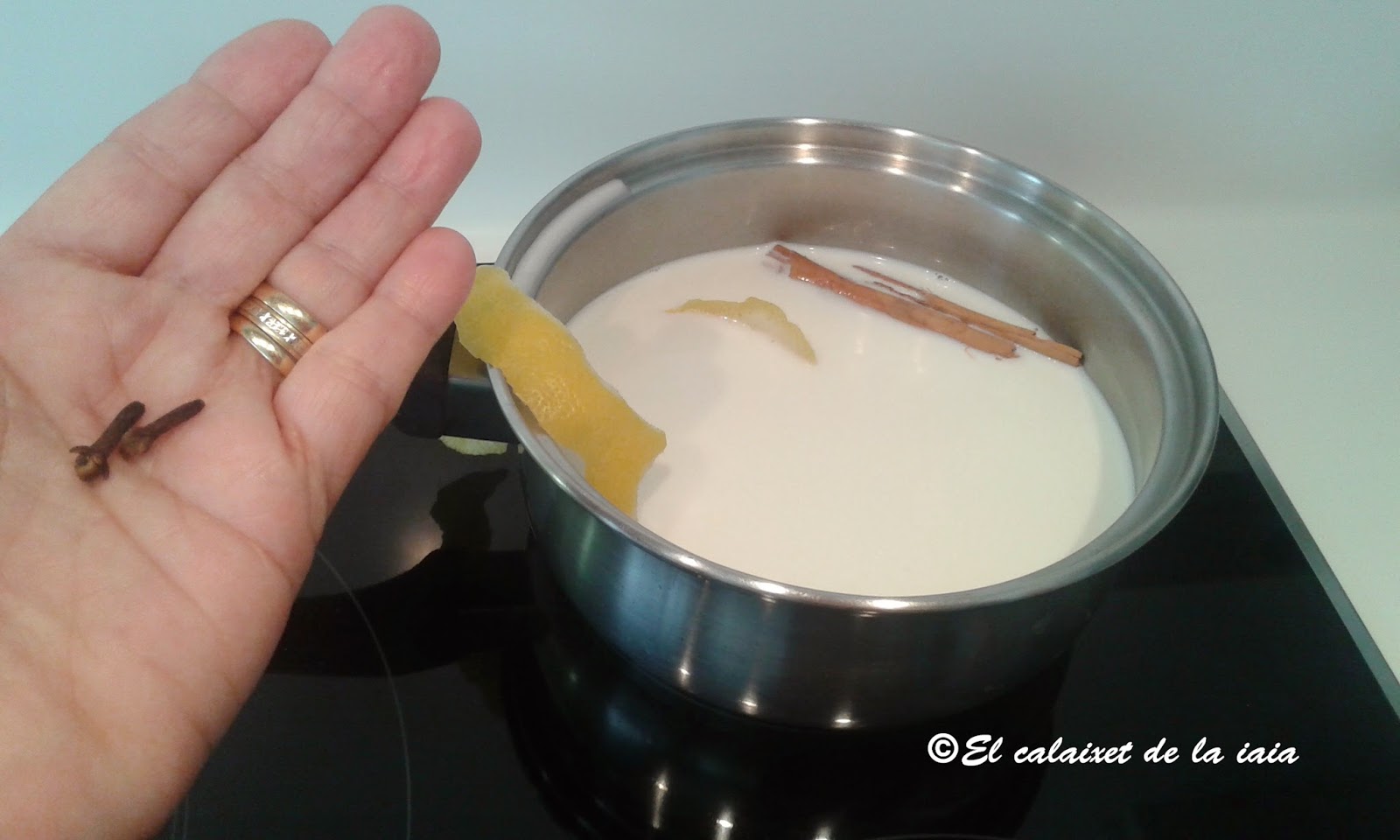 Comenzaremos poniendo a hervir la leche, la canela, la piel del limón (sin la parte blanca porque amarga) y tres clavos de olor. Que de un par de hervores y la dejaremos reposar unos minutos para que infusione y se asienten bién los aromas.