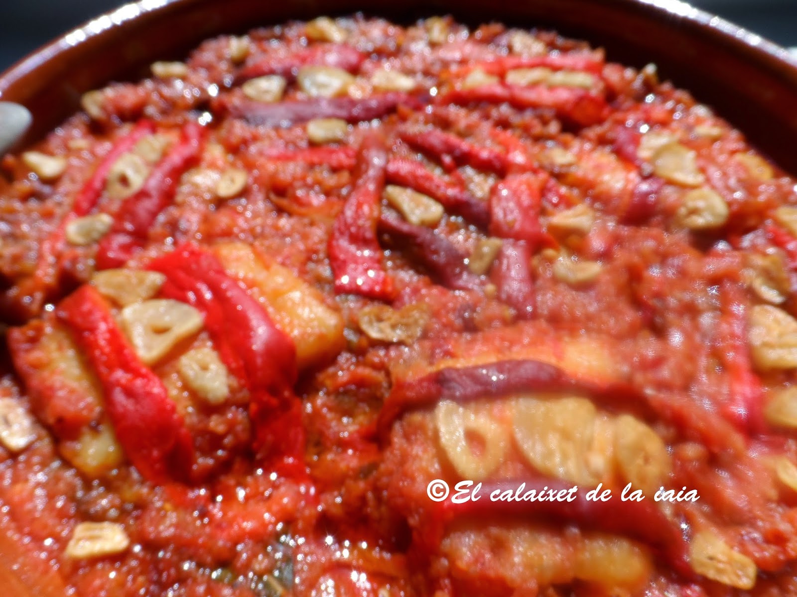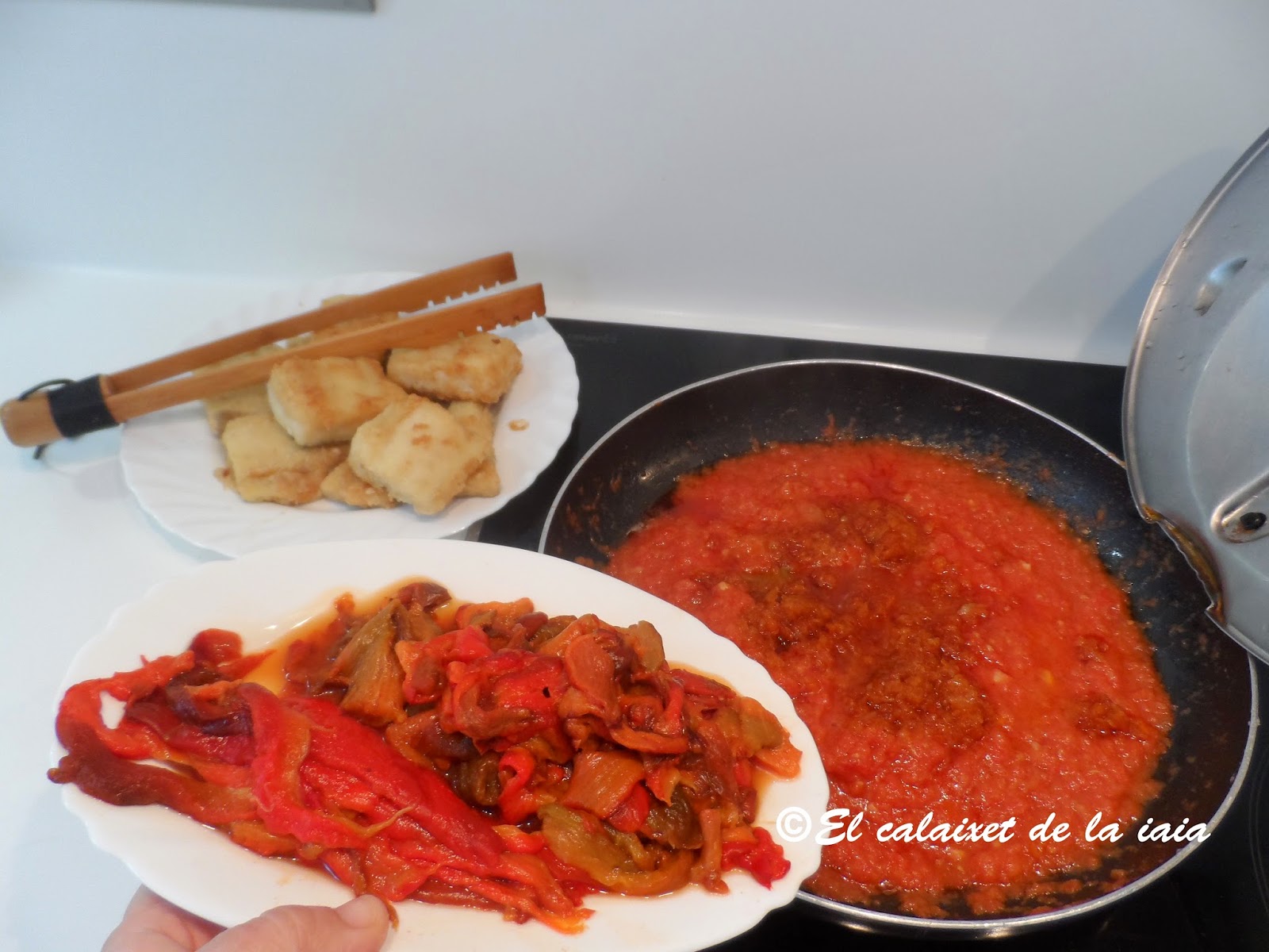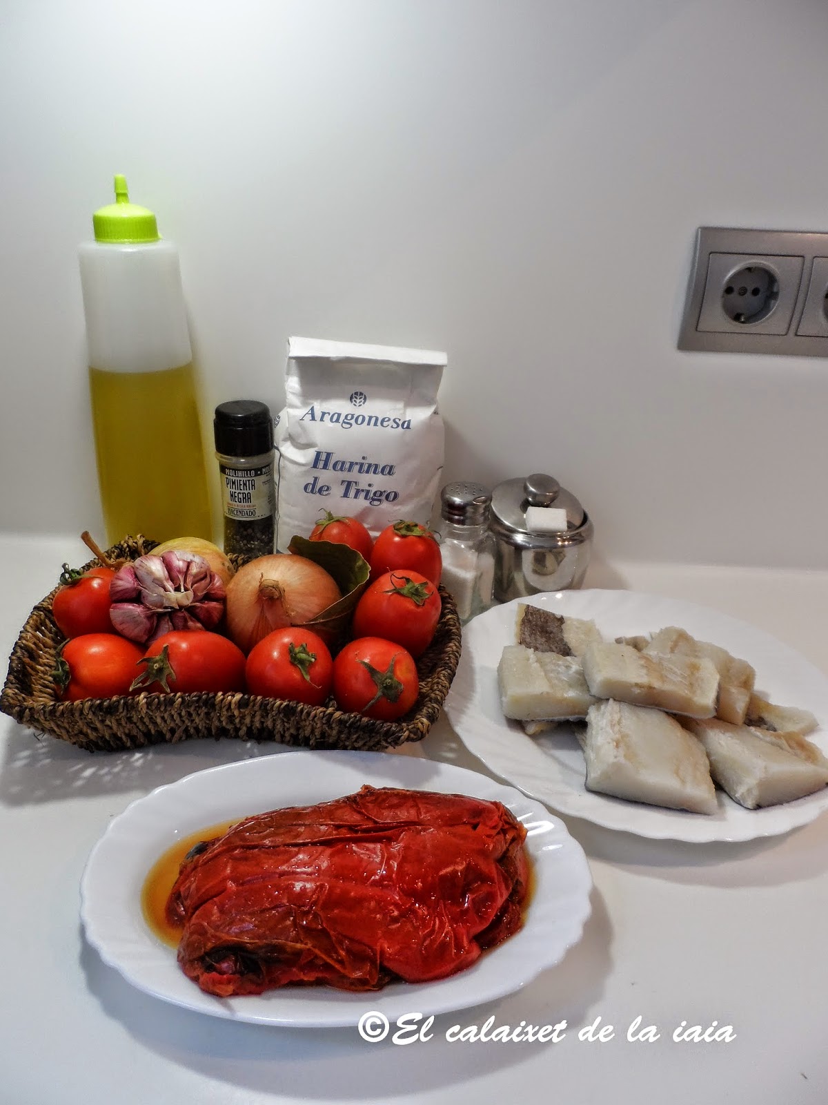 Hoy otra comida de Cuaresma, Bacalao con tomate y pimientos, también llamado Bacalao a la riojana, según me dijo una amiga de Nájera, aunque mi receta es la cabanyalera, no se si allí en La Rioja lo harán igual, también hay quien le pone el pimiento choricero y el bacalao desmigado y le llama Bacalao ajoarriero, pero este es el que siempre han hecho mis iaias, y comparto con todos vosotros su receta tradicional.