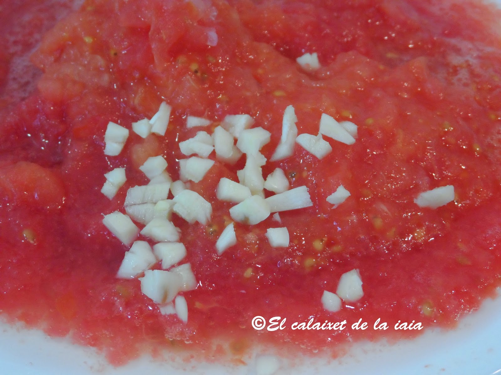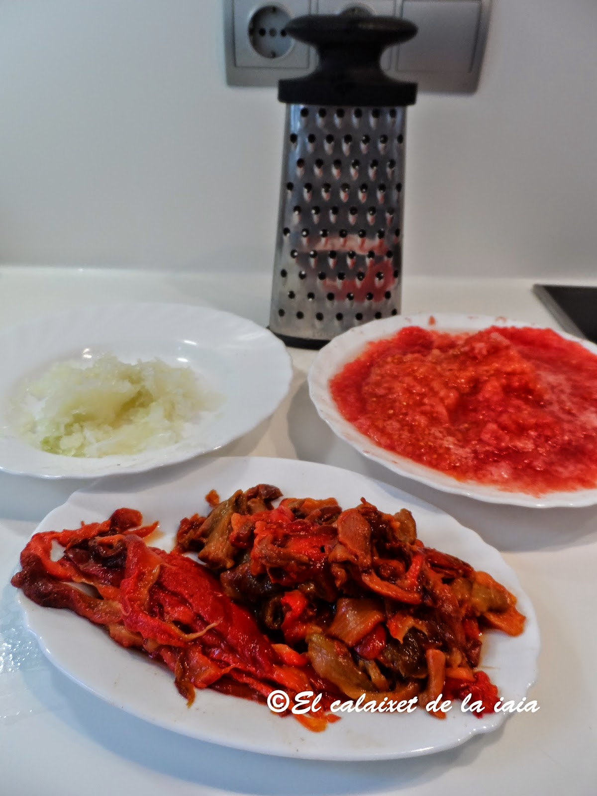 Rallamos la cebolla y el tomate. Siempre que os sea posible, usad tomates naturales maduros, no tienen nada que ver con los tomates en conserva comercializados, y no cuesta tanto rallarlos…..