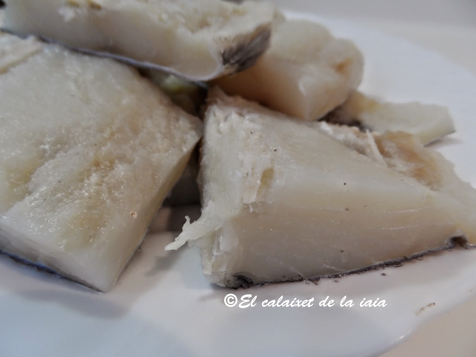 Todos los ingredientes están comprados en el Mercat del Cabanyal, donde es una gozada comprar cualquier producto, son frescos y naturales, a éste bacalao le llaman bacalao labrador y viene a estar por unos 12€ el k. mas o menos. Pedid que os lo troceen.