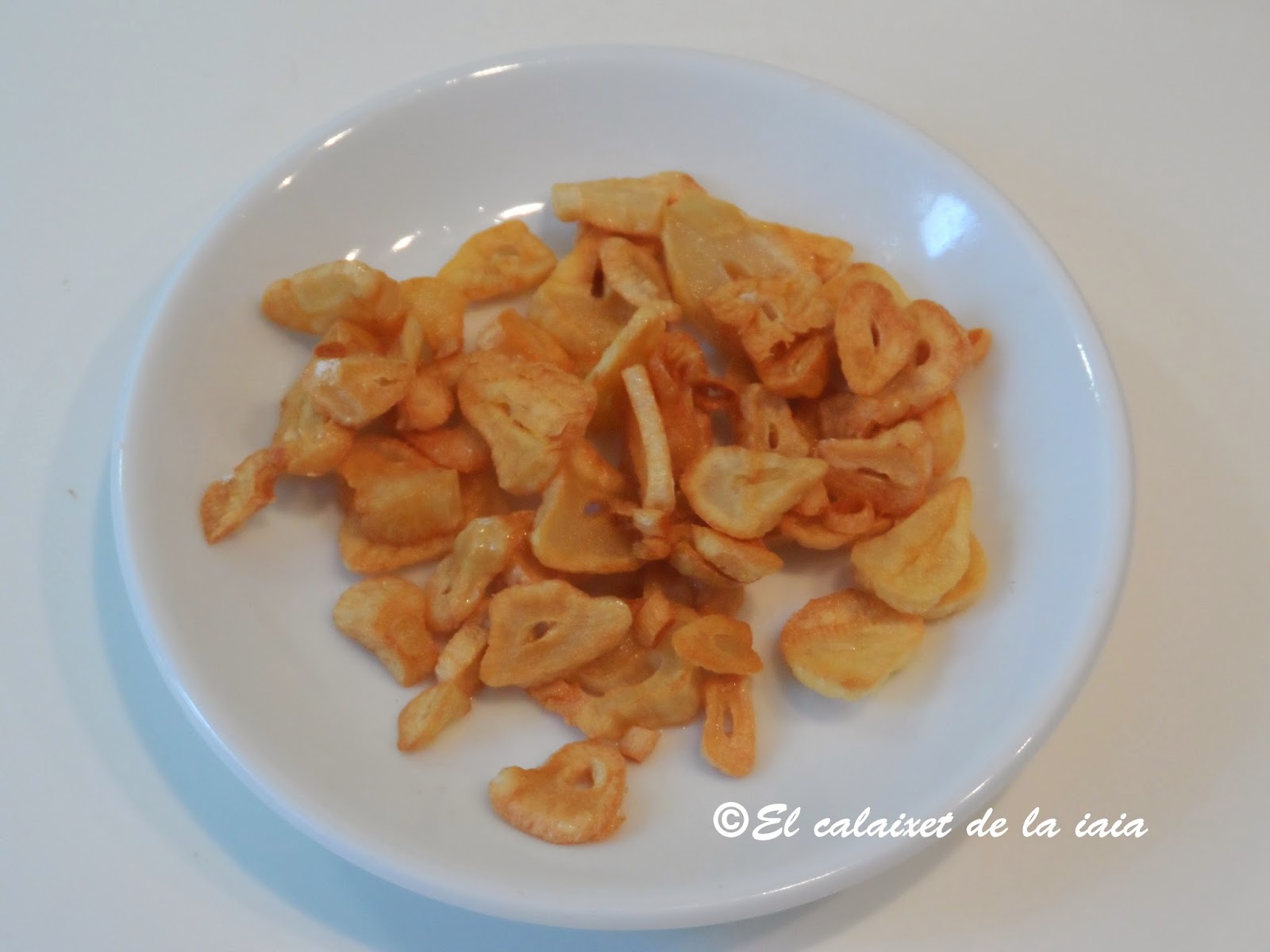 Una vez dorados los ajos, los sacamos de aceite y reservamos, recordad que han de estar dorados, pero no quemados o amargarán.