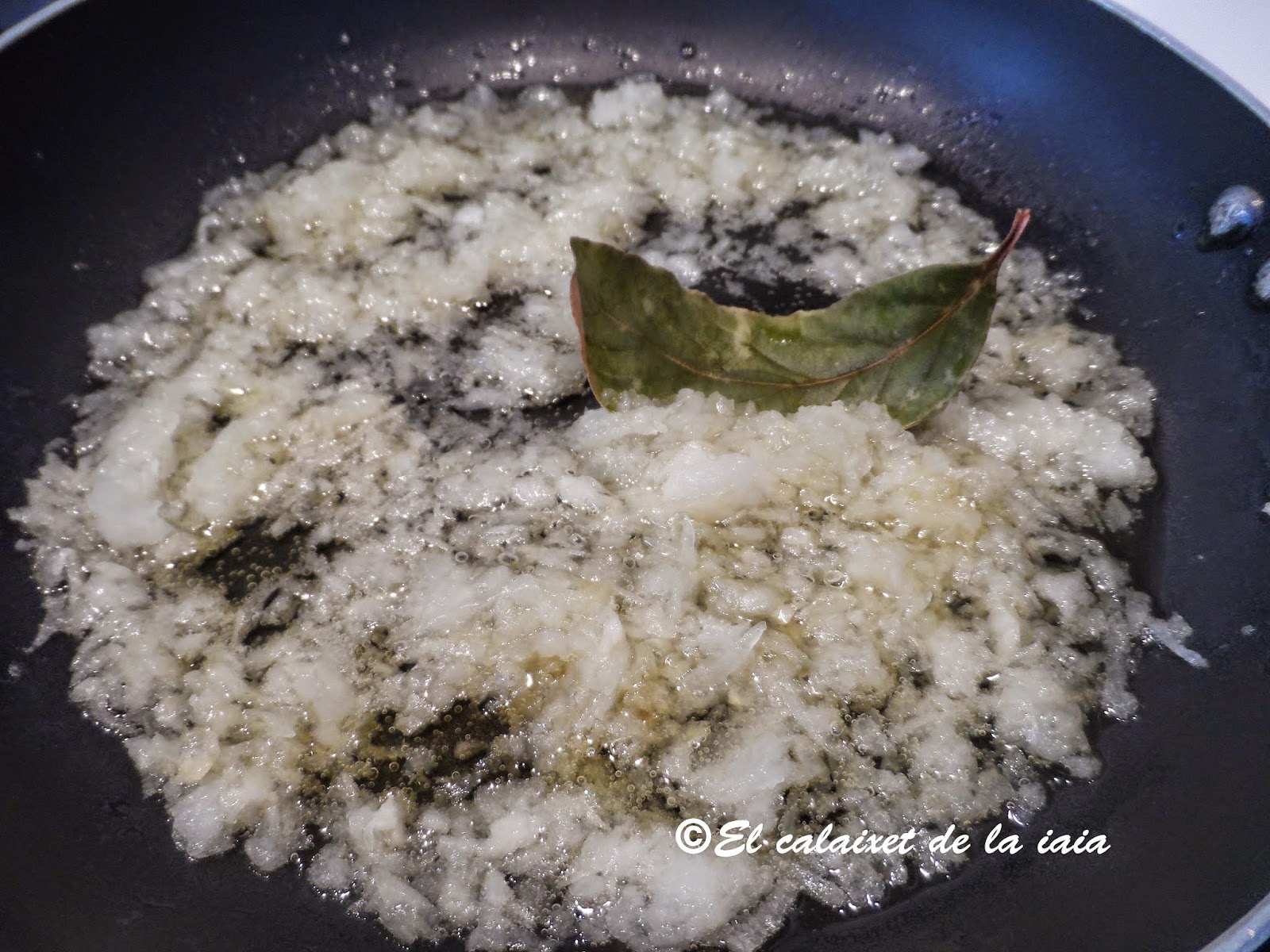 añadimos la hoja de laurel enjuagada y dejamos pochar a fuego lento