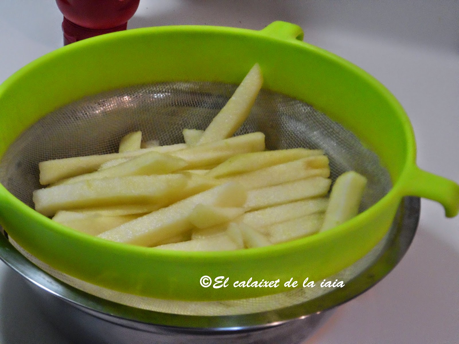 Pelaremos la manzana y la cortaremos como si fueran patatas fritas