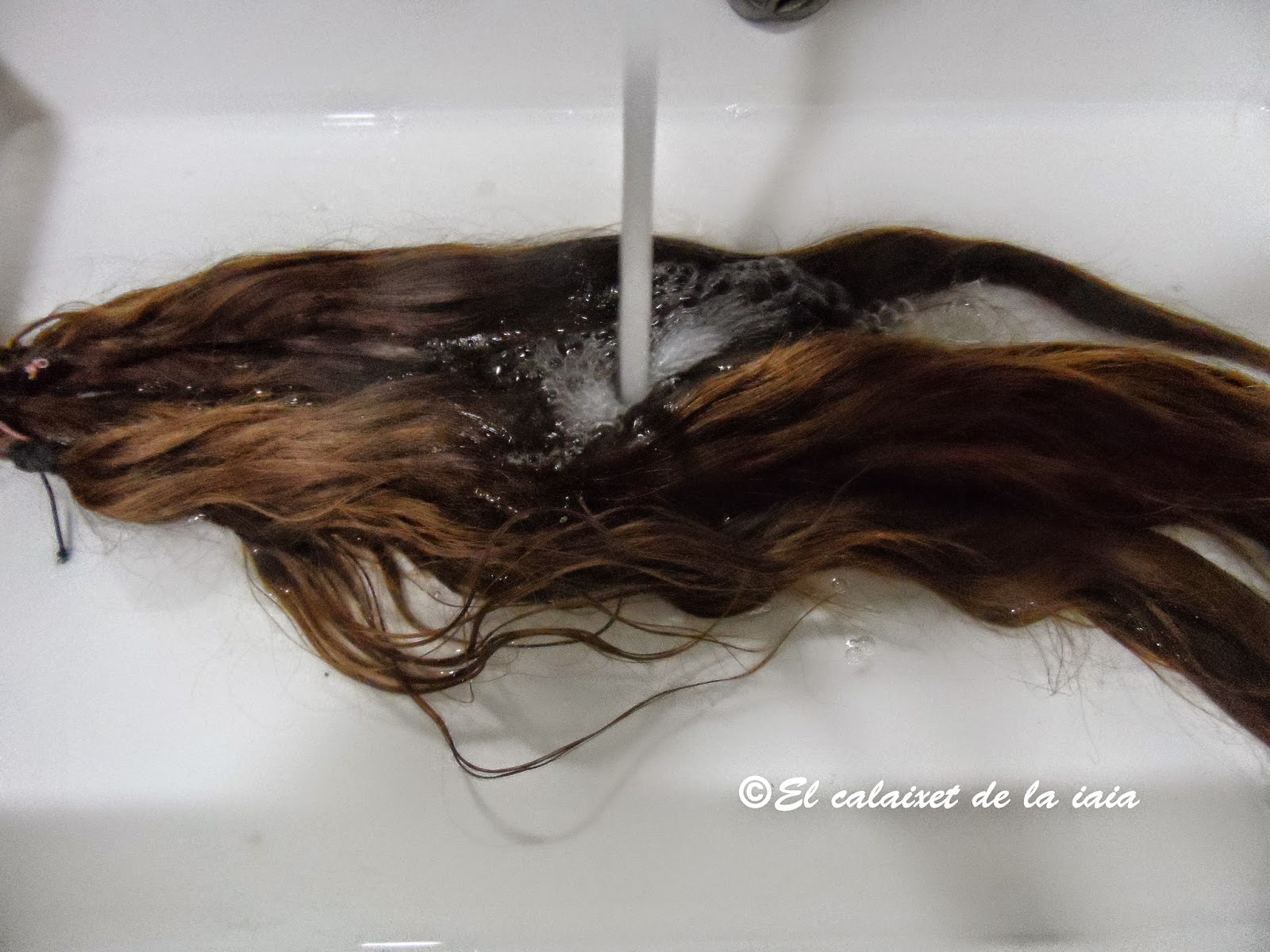 siempre de arriba hacia abajo, en la dirección del pelo, deslizaremos la mano para que penetre bien el agua y el jabón y puedan eliminarse los resto jamás frotéis las mallas ésto es muy, muy muy importante, ya que si lo hacéis, podéis enredar el pelo y se estropean, sin arreglo posible. No hace falta utilizar ningún tipo de suavizante, pero os recomiendo un chorrito de vinagre en el último aclarado, es lo que me enseñó mi mami a hacer, cada vez que terminaban fallas.