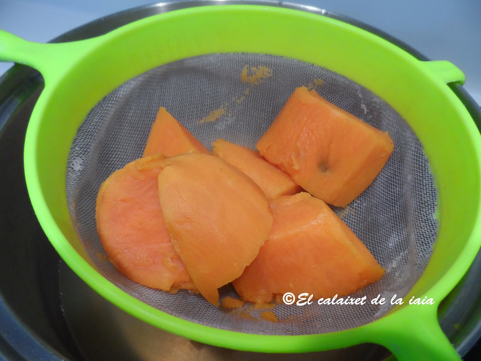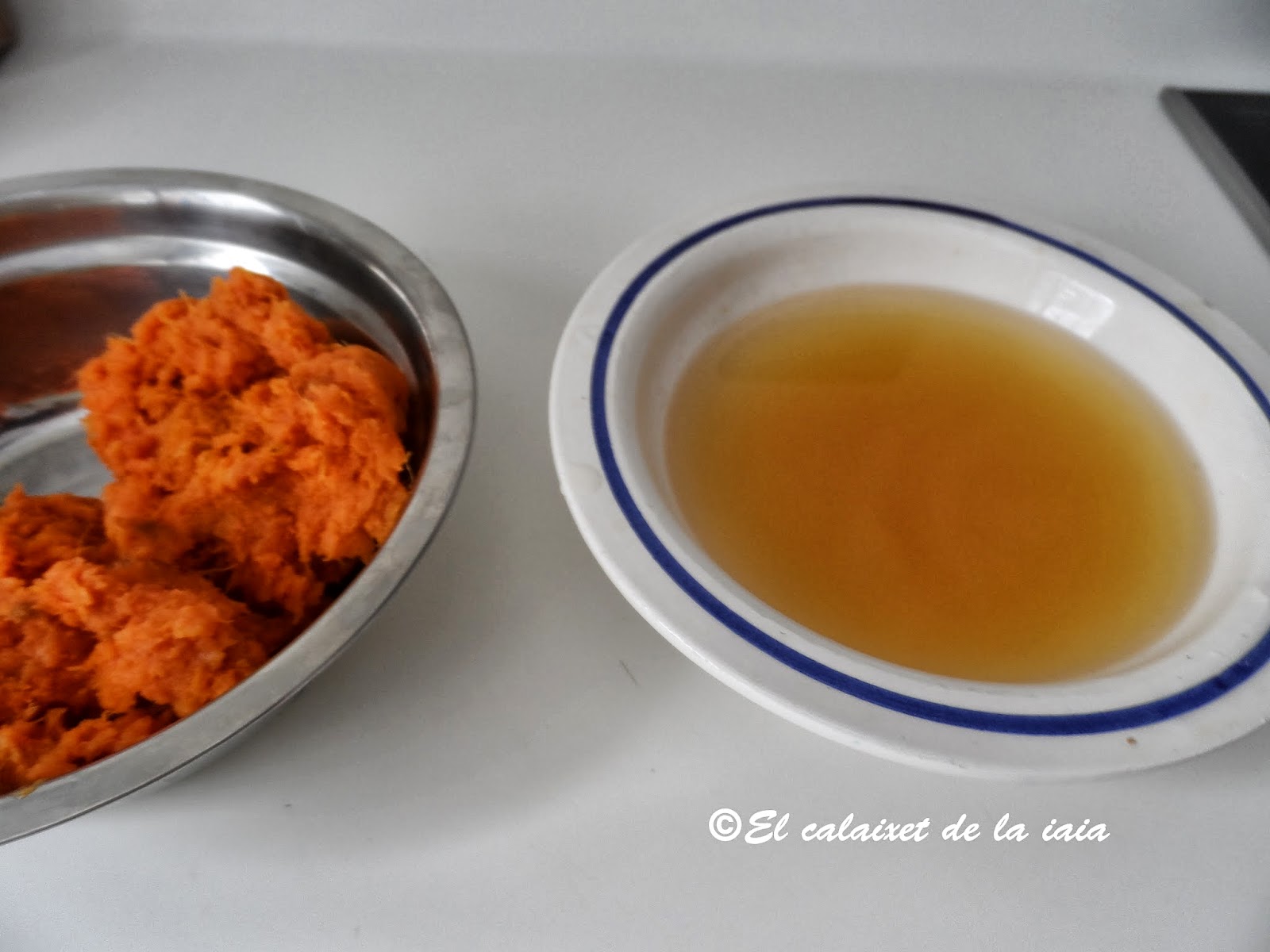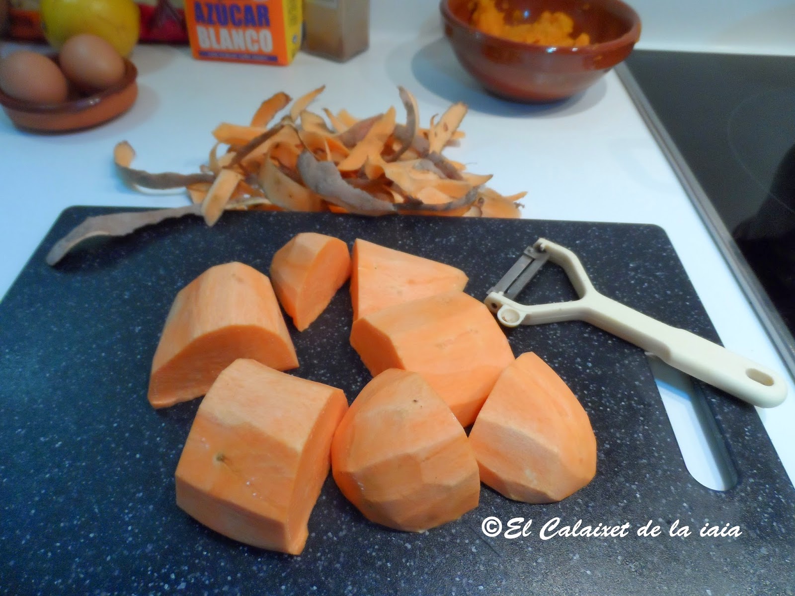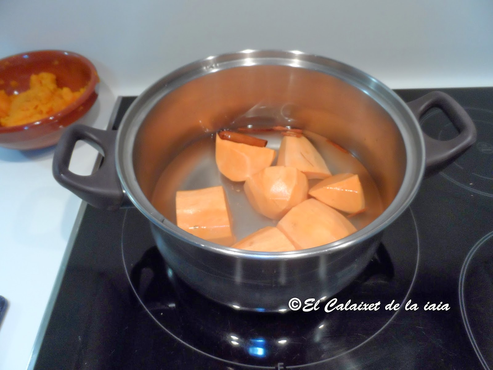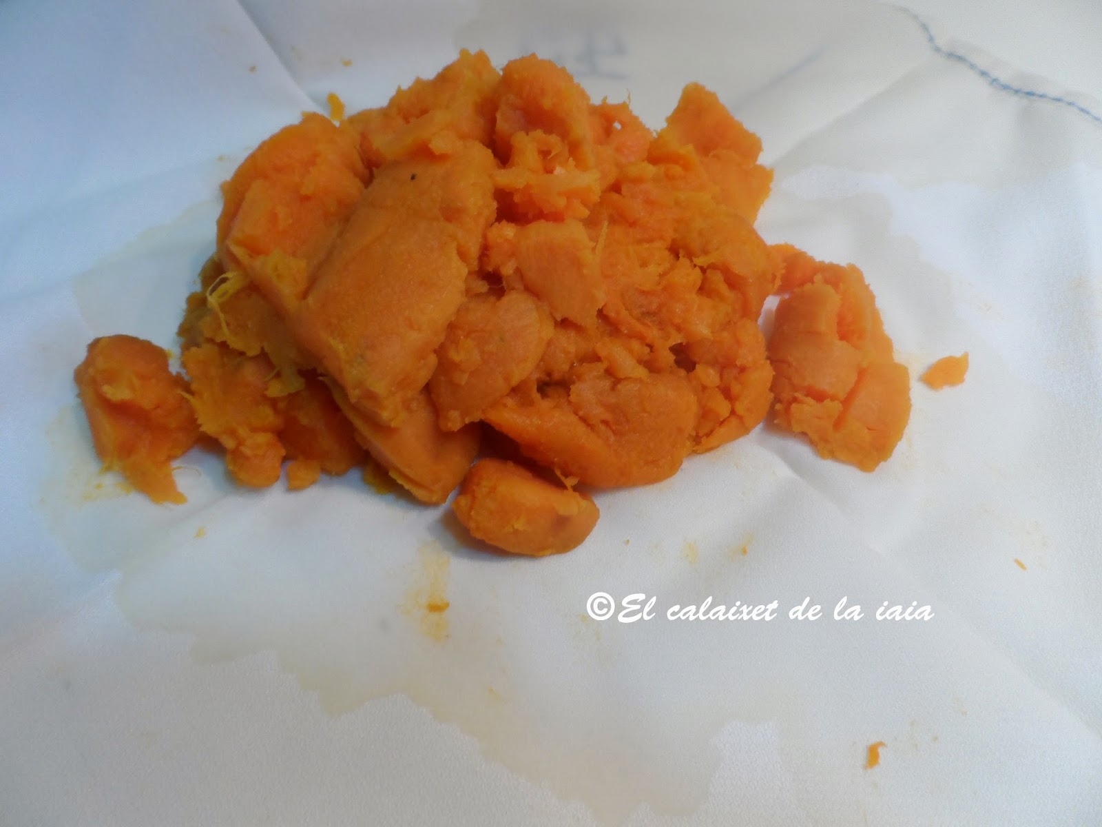 Como ya traigo la calabaza asada en el horno, por no ponerlo de nuevo en marcha, herviré el moniato. Cuando lo cocinéis asad el «moniato» y la calabaza juntos en el horno, olvidé el boniato en casa, y en el pueblo, tengo calabazas, pero no boniatos, pero lo ideal, es asarlo todo junto.