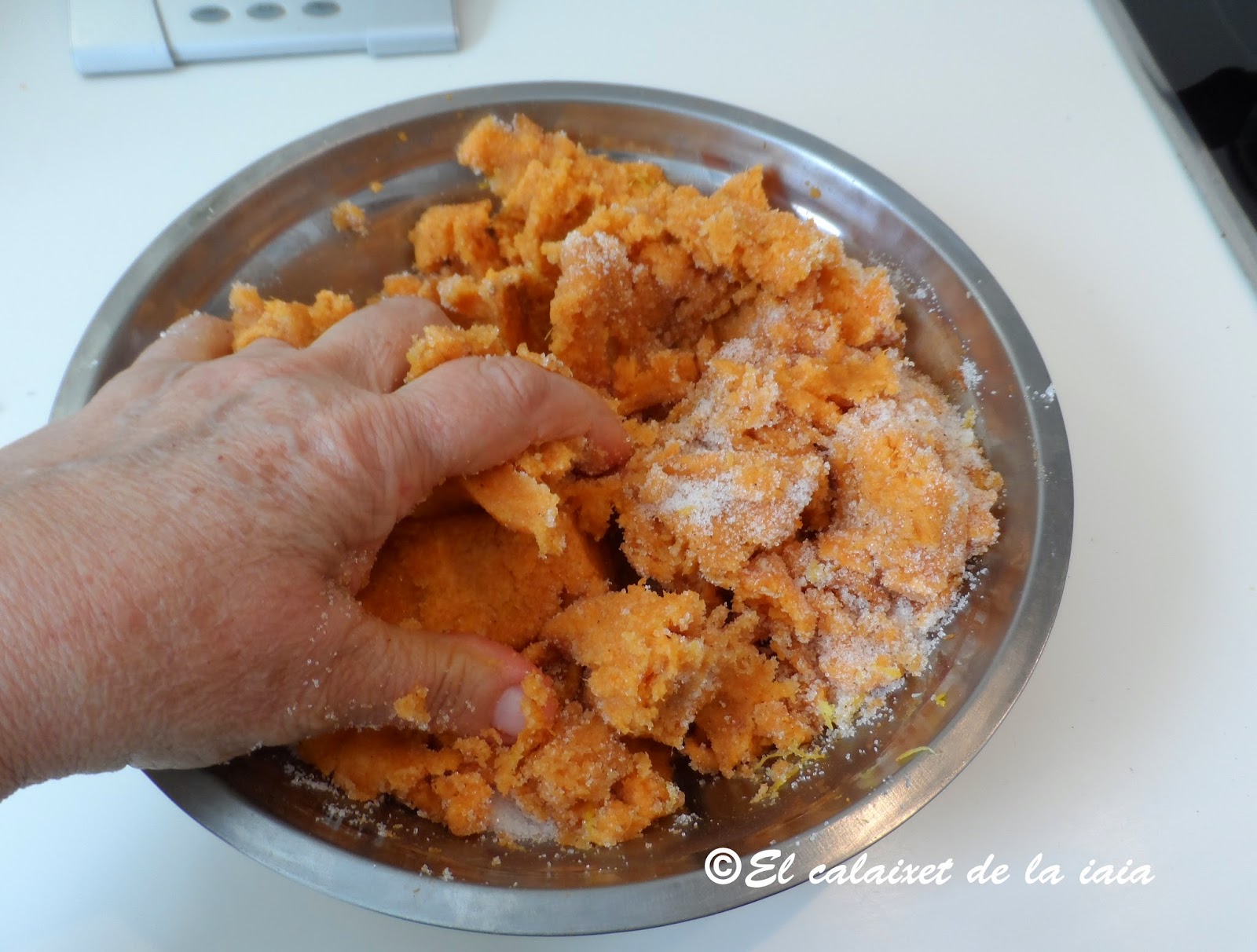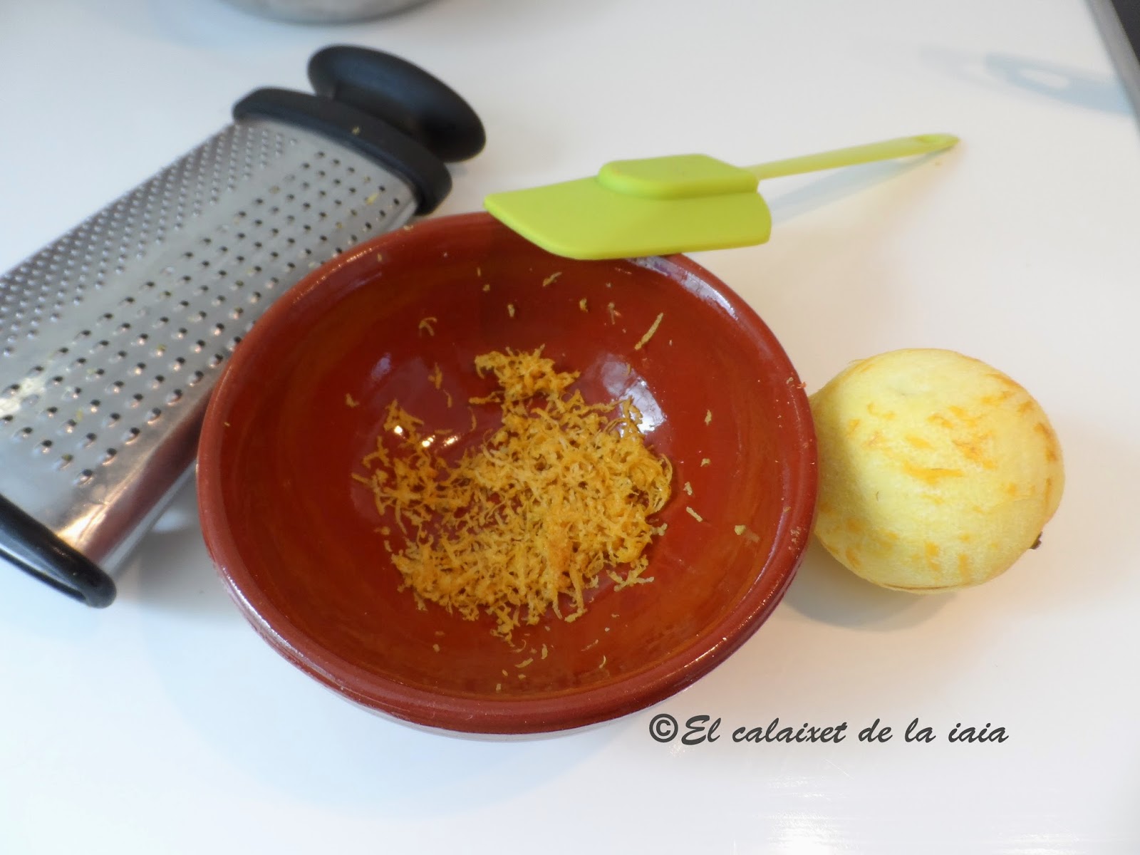 lavamos el limón y lo secamos para a continuación rallarlo con cuidado, pero solamente la zona de piel que tiene color, o sea el flavedo, que es donde están los aceites aromáticos y evitaremos la parte blanca llamado albedo, porque amarga. Estos datos, son el fruto de muchas tardes de verano pasados en los bancales, junto a mi queridísimo iaio Antoniet «Toni de Gallò», y añadiremos la ralladura