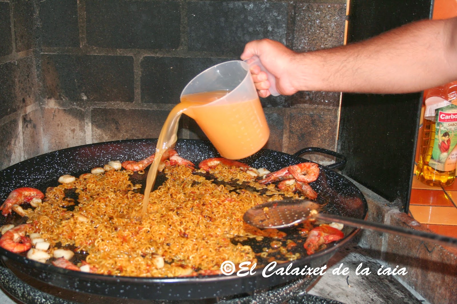 procuramos tener todo dispuesto a mano antes de proceder a prenderle fuego a la paella. En ésta ocasión no pudimos usar caldo de morralla o fumet y tuvimos que conformarnos con caldo de brik comercial. Por supuesto «cuando no hay lomo, de todo como» pero si podéis usar el fondo de pescado o fumet casero, no dudéis en hacerlo 😉 de verdad que la diferencia es notoria