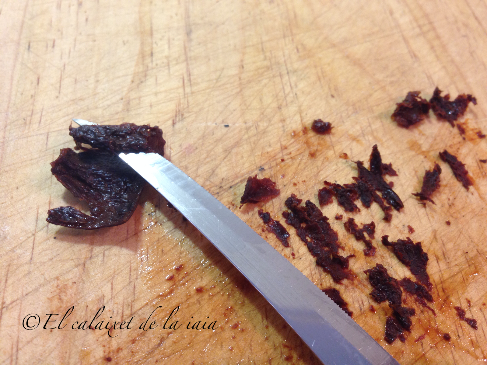 Para agasajarlos, se me ocurrió hacer una «Paella d’arròs negre», en el paellero. Puse seis ñoras pero… en mi ignorancia de novata, no se me ocurrió otra cosa que hidratarlas, aunqueeee las puse tal cual, si, si, cómo leeéis, enteras y con piel incluídas. Cuando mi iaia, madre y tíos vieron aquellos flotadores rojos, cual boyas en el mar, flotando entre el arroz negro, se partían de risa. Porque claro ¿a quien se le ocurre no sacar la carne de la ñora? pues ya véis a miiiii… jajajajaja, como buena novata. Ya veis que nadie nacemos sabiendo, todo requiere un aprendizaje. Bueno pues ya sabéis, a la ñora (igual que al pimiento choricero) se le saca la carne cómo veréis luego, y para eso se pone a hidratar. Aunque os tengo que contar, que no hace mucho, fuimos a un restaurante muy conocido de la playa… y nos presentaron las ñoras, en medio de la paella, preguntamos al cocinero y nos dijeron que las usaban como decoración. Mare mèua!