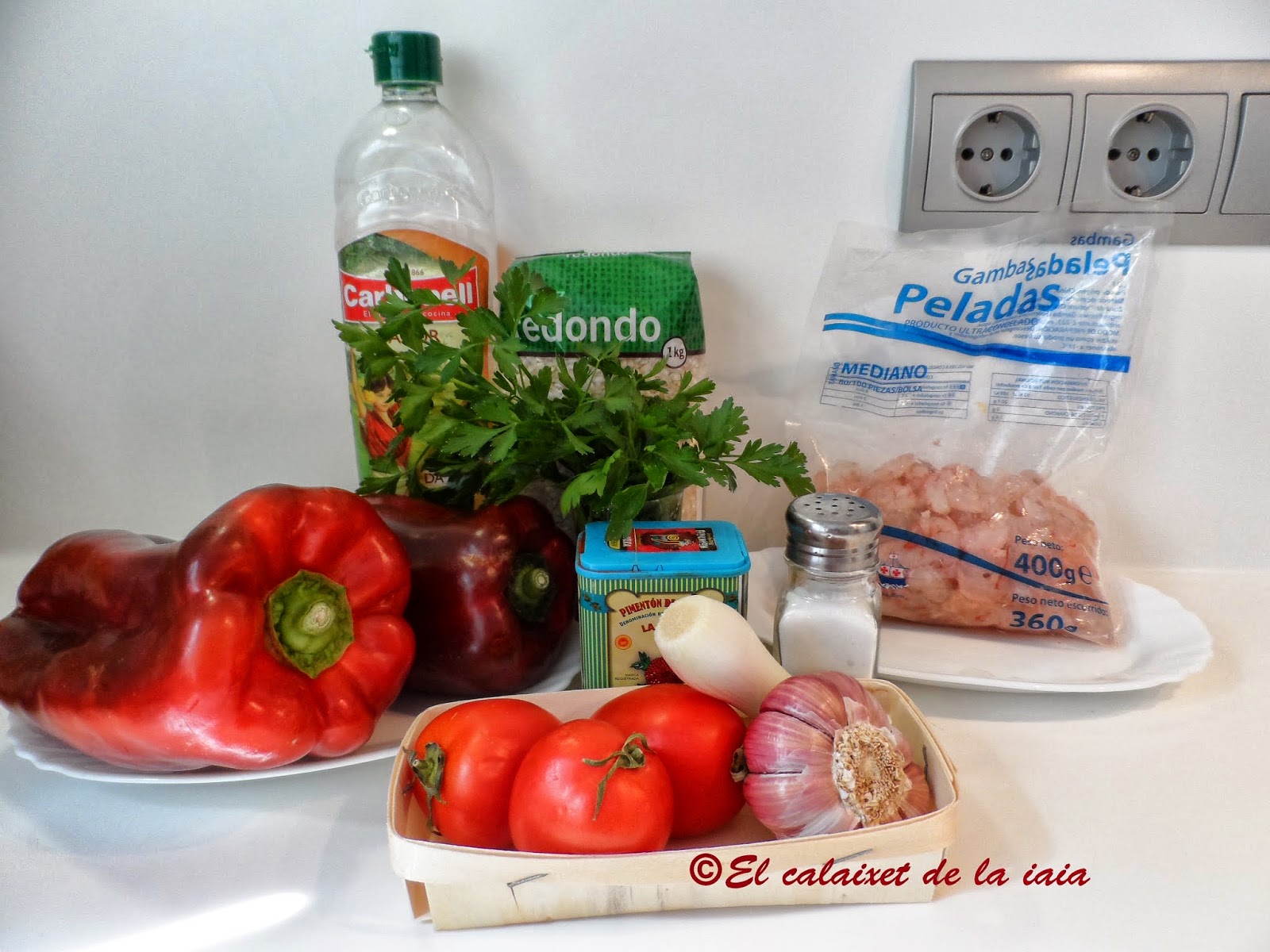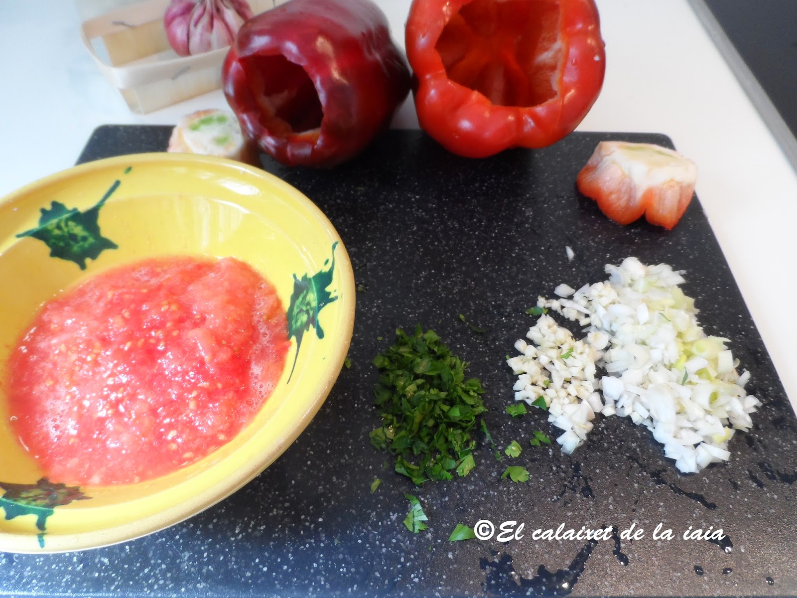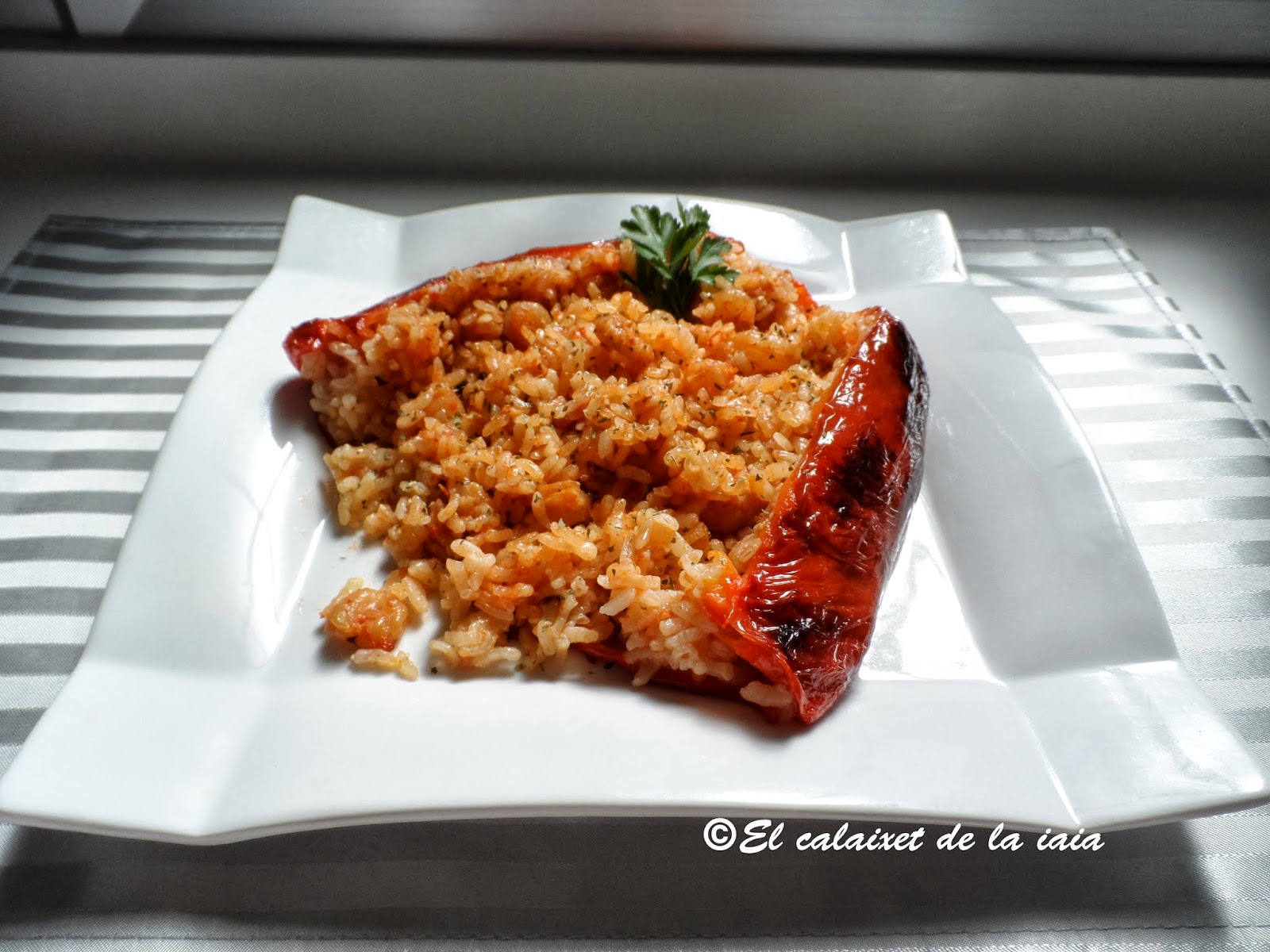 - Dos pimiento rojos, grandes de unos 150 g cada uno y de culo redondeado si es posible (para que no se rompan al cocerse dentro el arroz)