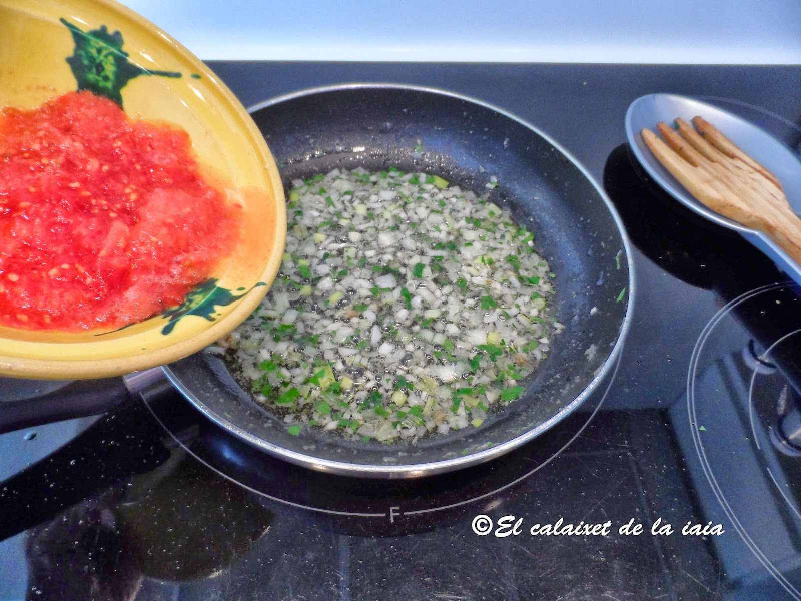 rallamos el tomate pelamos y picamos el perejil, el ajo y la cebolla