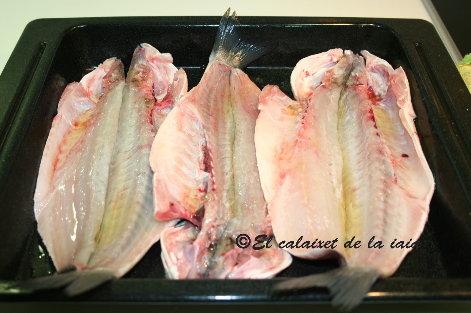 En la pescaderia pedimos que nos quiten la espina central y la abran para hacer a la espalda. Las enjuagamos y las colocamos con la piel hacia abajo en una bandeja apta para horno. Precalentamos el horno a 180º