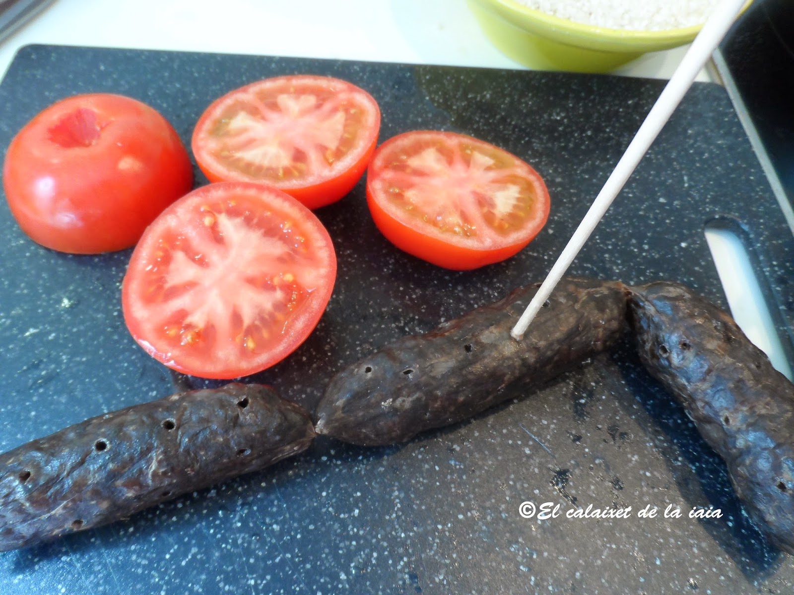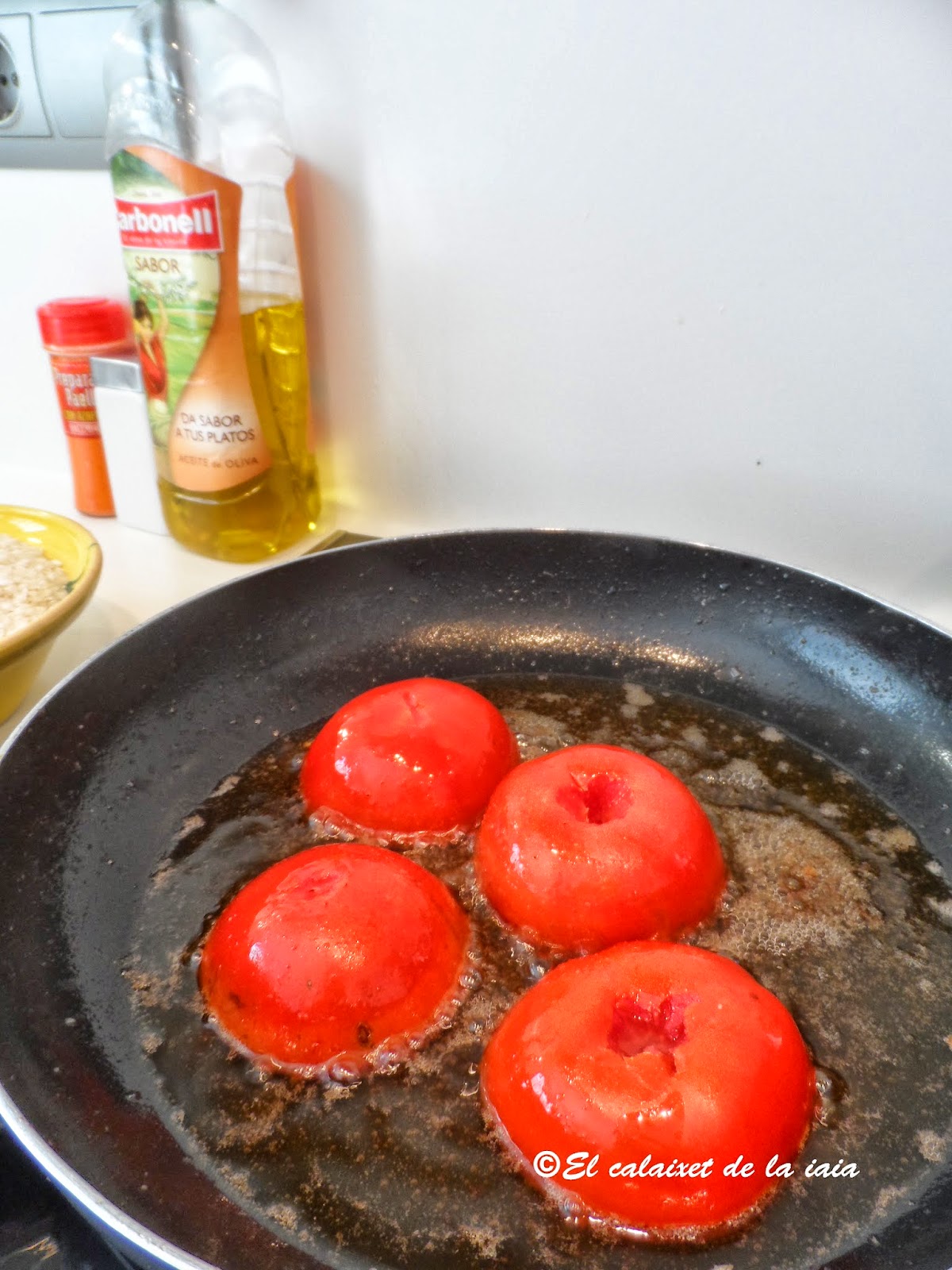 Mis iaios paternos cuando vinieron de La Safor, vivían aquí en Valencia, en una casita con corral, junto a la estación del Cabanyal, los jueves, día de mercado, la iaia Isabel hacía siempre su arròs al forn y mi prima Isabelín y yo, nos apuntábamos a comer a casa de la iaia, y ayudábamos al iaio Antoniet a dar de comer a los conejos. Era un ritual, ver a la iaia Sabeleta, poner su tabla de madera y rollo de tela sobre su cabeza y trasladar la cazuela recién hecha a casa, para deleitarnos con su arroz. A mi me encantaba (y me encanta) acompañar ese arroz con los pimientos y tomates en «salmorra» que tenía preparados el iaio Antoniet en la «jarra», en un rincón del corral.